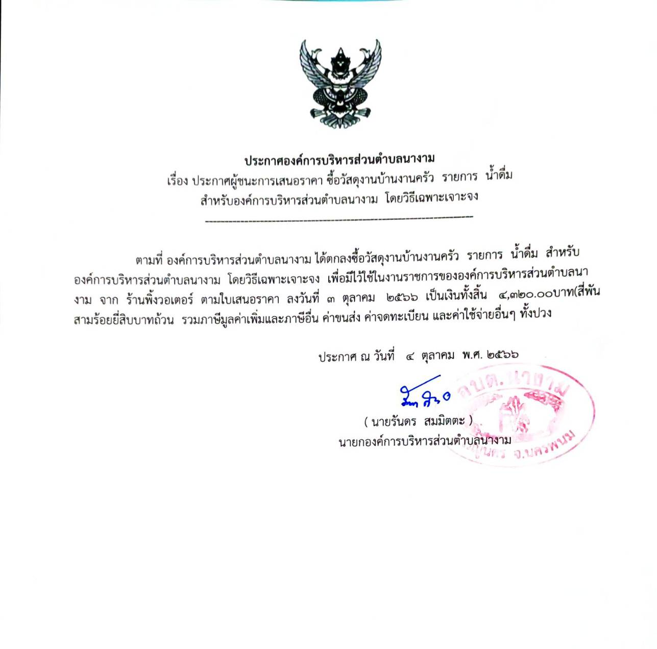ชื่อเรื่อง : ประกาศผู้ชนะการเสนอราคา ซื้อวัสดุงานบ้านงานครัว รายการ น้ำดื่ม สำหรับองค์การบริหารส่วนตำบลนางาม โดยวิธีเฉพาะเจาะจง