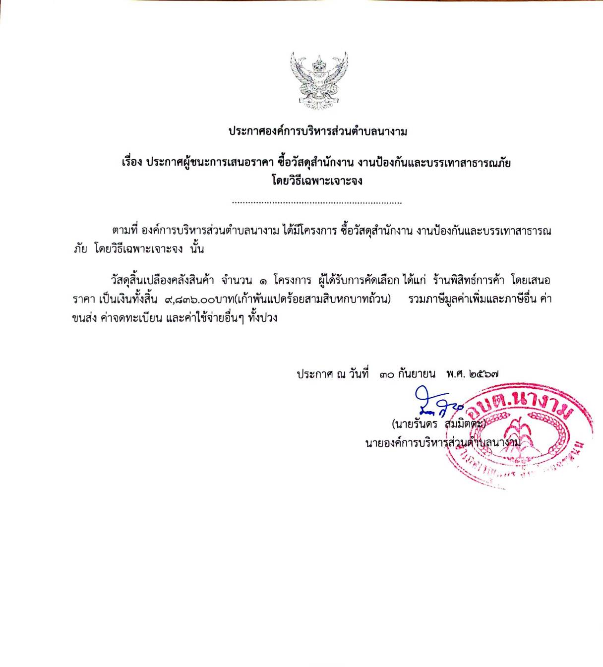 ชื่อเรื่อง : ประกาศผู้ชนะการเสนอราคา ซื้อวัสดุสำนักงาน งานป้องกันและบรรเทาสาธารณภัย โดยวิธีเฉพาะเจาะจง
