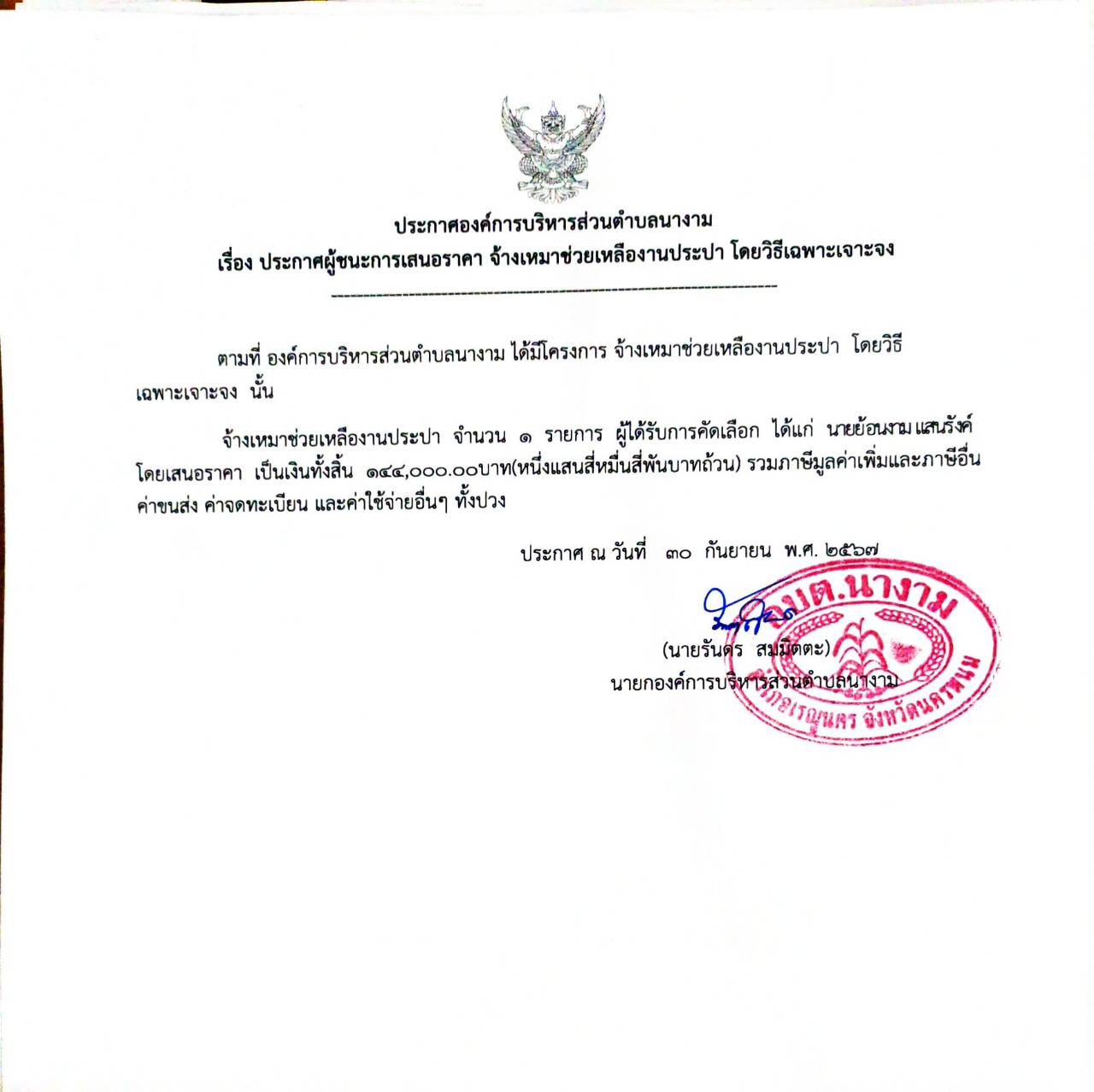 ชื่อเรื่อง : ประกาศผู้ชนะการเสนอราคา จ้างเหมาช่วยเหลืองานประปา โดยวิธีเฉพาะเจาะจง