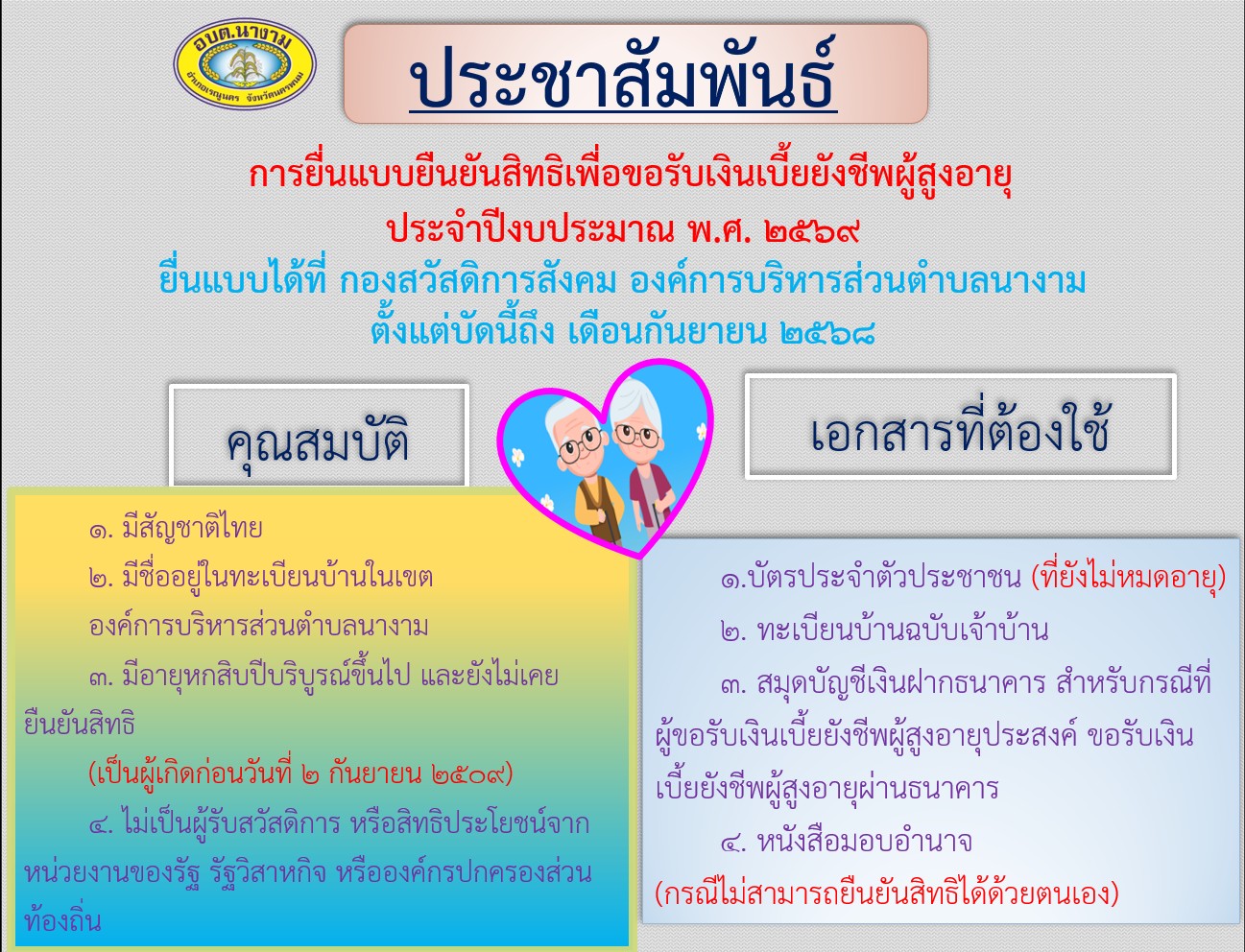 ชื่อเรื่อง : การยื่นแบบยืนยันสิทธิเพื่อขอรับเงินเบี้ยยังชีพผู้สูงอายุ ประจำปีงบประมาณ พ.ศ. 2569
