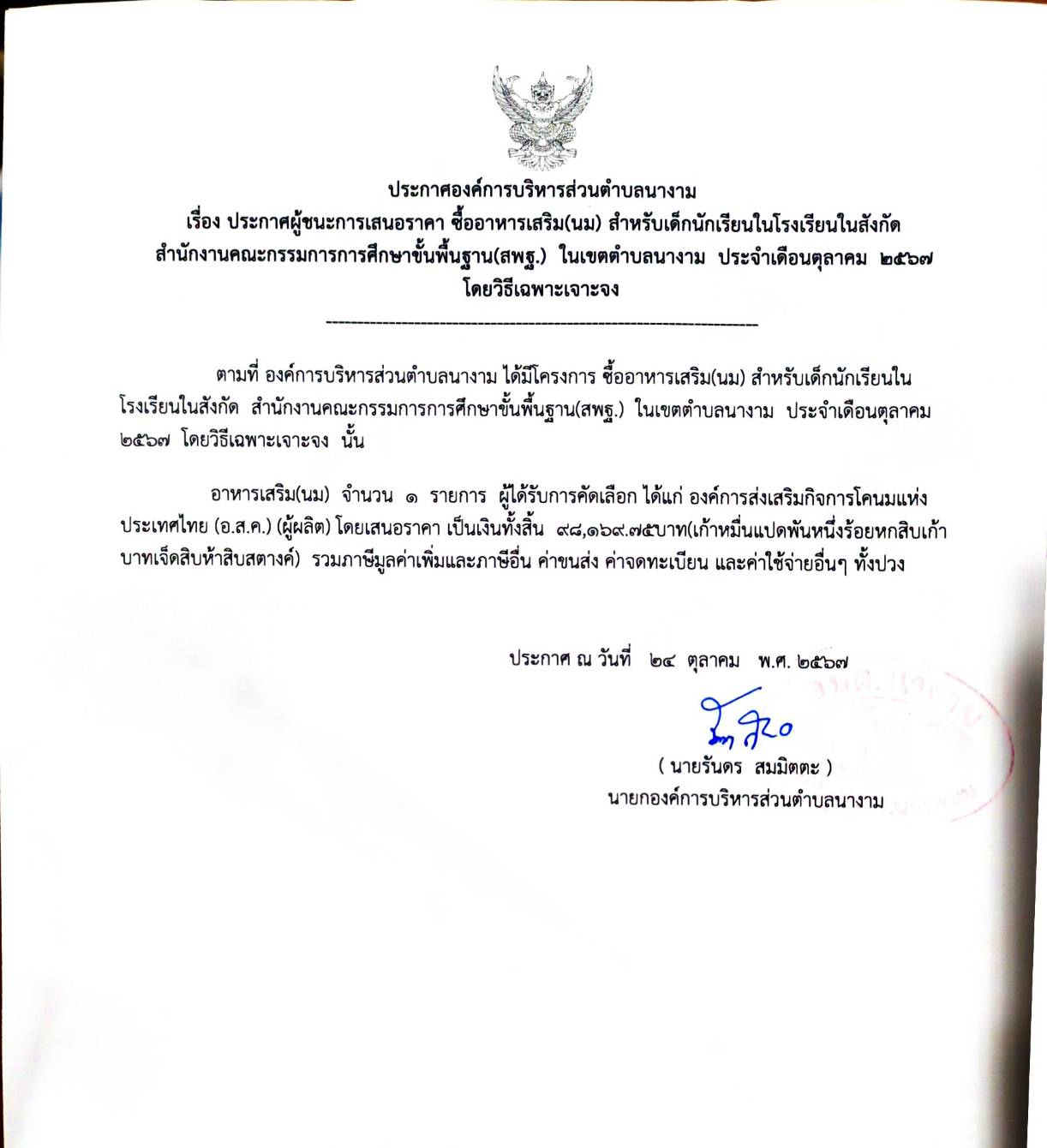 ชื่อเรื่อง : ประกาศผู้ชนะการเสนอราคา ซื้ออาหารเสริม(นม) สำหรับเด็กนักเรียนในโรงเรียนในสังกัด สำนักงานคณะกรรมการการศึกษาขั้นพื้นฐาน(สพฐ.) ในเขตตำบลนางาม ประจำเดือนตุลาคม ๒๕๖๗ โดยวิธีเฉพาะเจาะจง