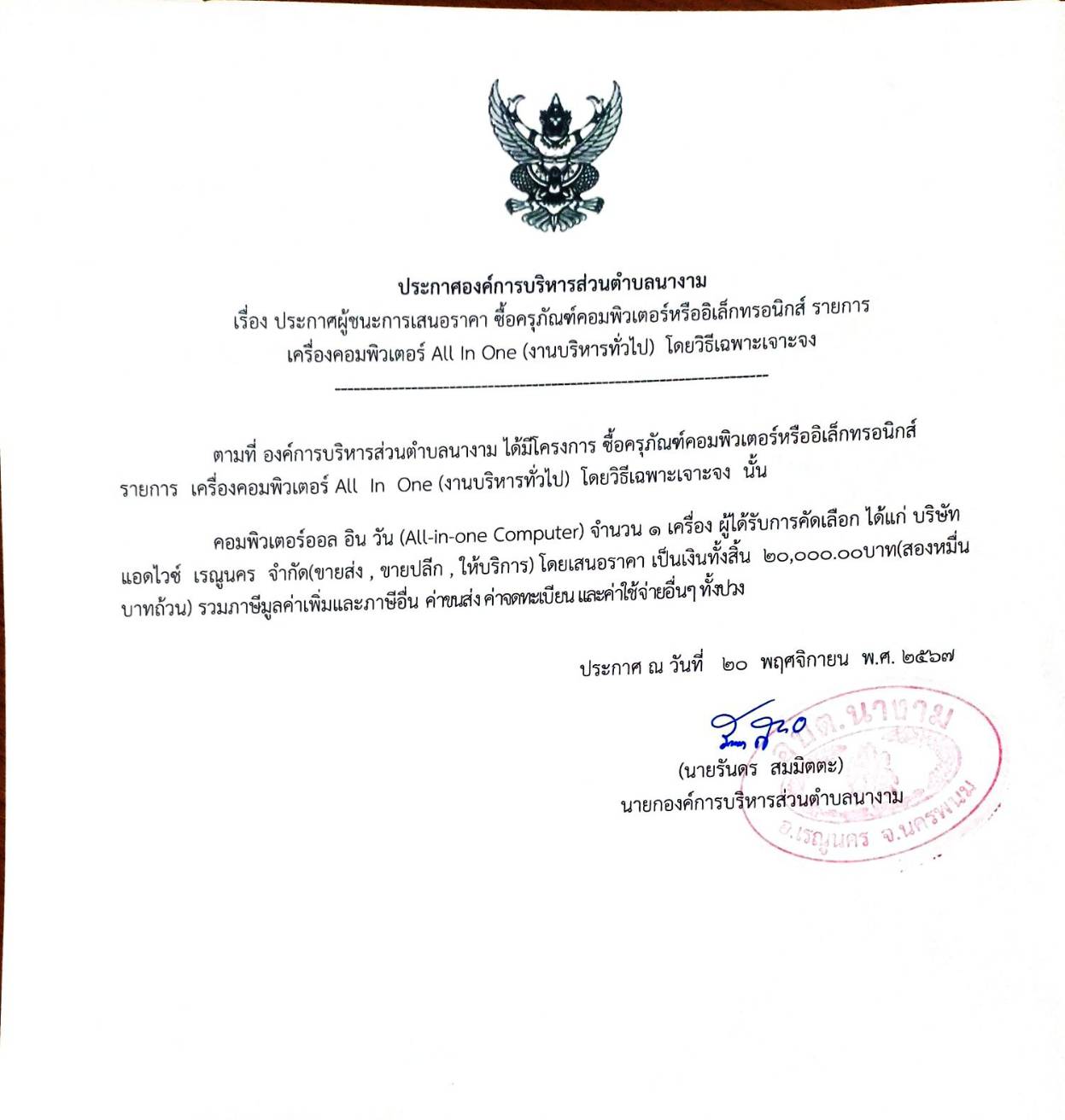 ประกาศผู้ชนะการเสนอราคา ซื้อครุภัณฑ์คอมพิวเตอร์หรืออิเล็กทรอนิกส์ รายการ เครื่องคอมพิวเตอร์ All In One (งานบริหารทั่วไป) โดยวิธีเฉพาะเจาะจง