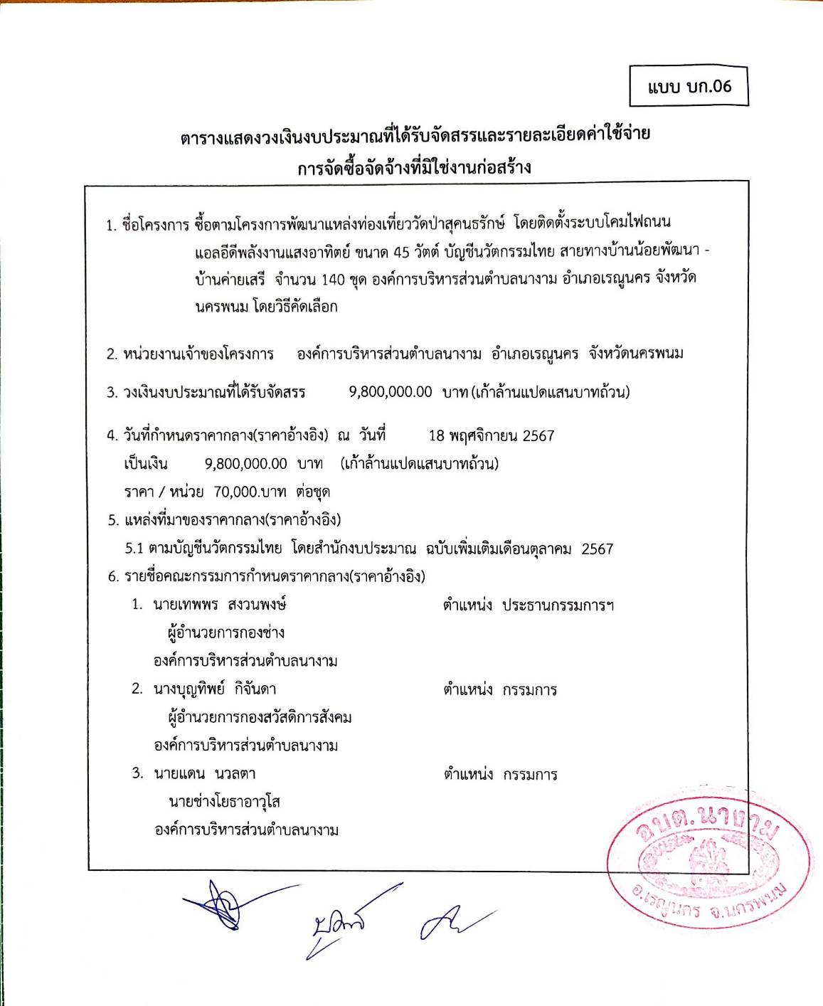 ชื่อเรื่อง : ประชาสัมพันธ์การเปิดเผยราคากลางซื้อตามโครงการพัฒนาแหล่งท่องเที่ยววัดป่าสุคนธรักษ์ โดยติดตั้งระบบโคมไฟถนนแอลอีดีพลังงานแสงอาทิตย์ ขนาด 45 วัตต์ บัญชีนวัตกรรมไทย สายทางบ้านน้อยพัฒนา - บ้านค่ายเสรี จำนวน 140 ชุด องค์การบริหารส่วนตำบลนางาม อำเภอเรณูนคร จังหวัดนครพนม โดยวิธีคัดเลือก