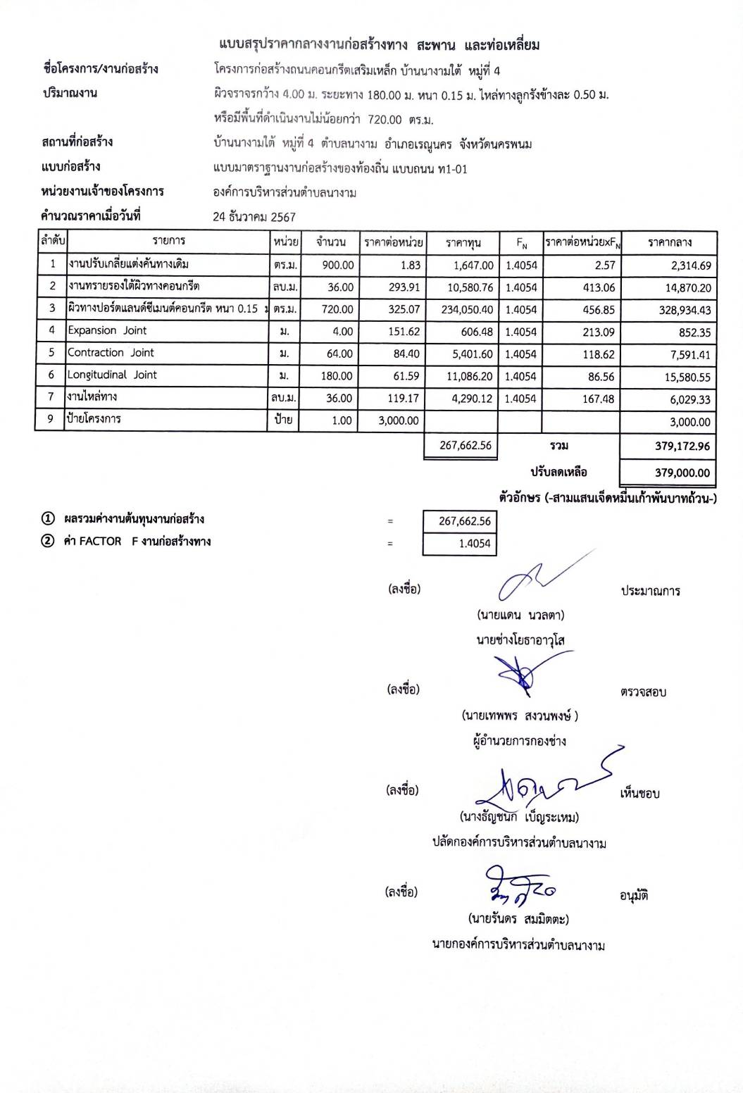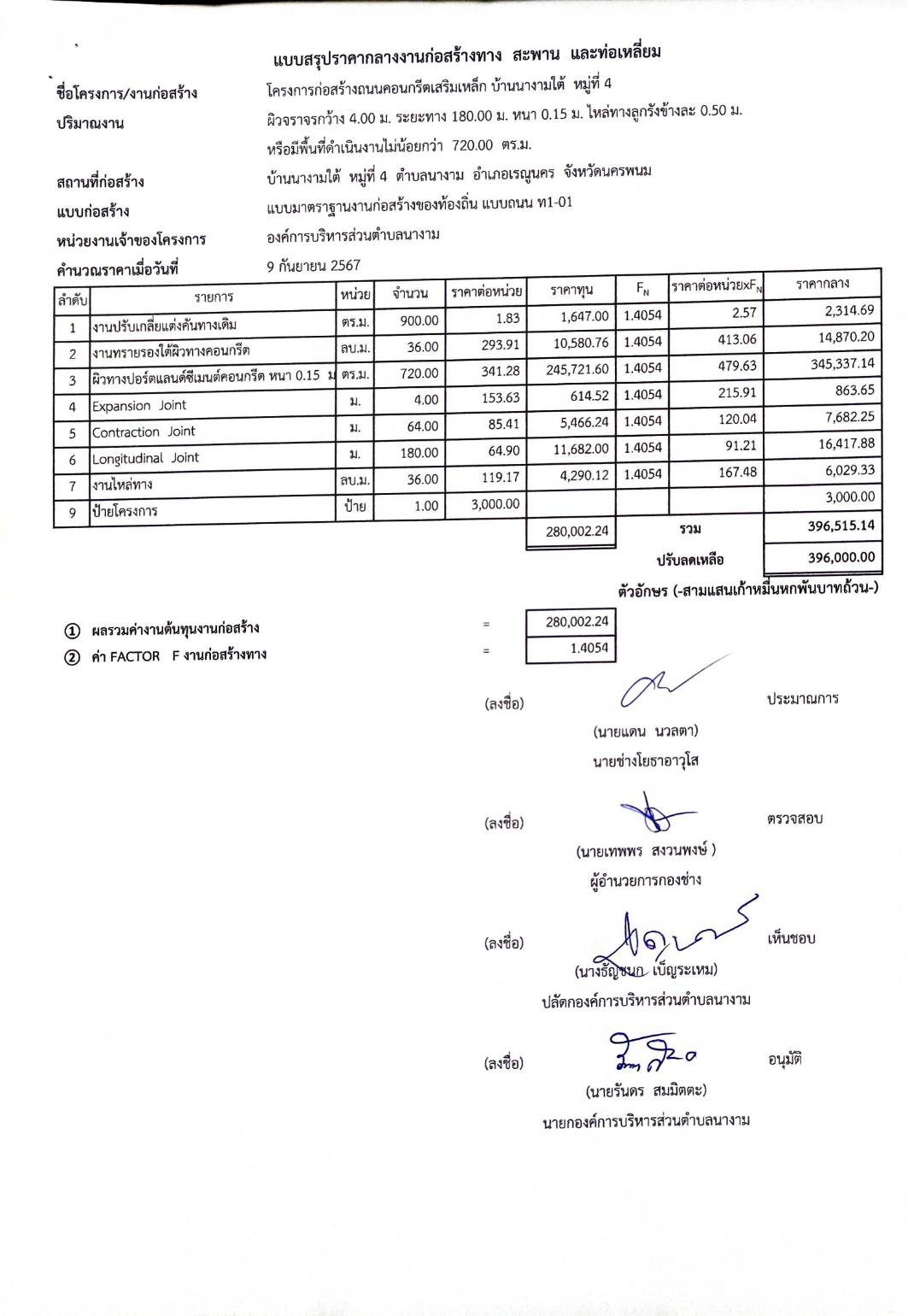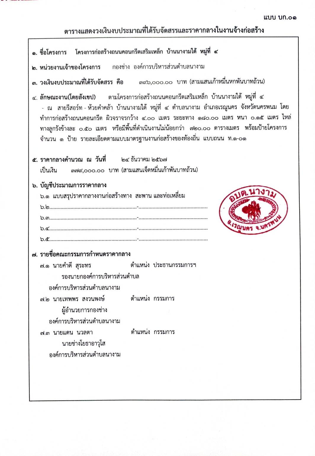 ประชาสัมพันธ์การเปิดเผยราคากลางจ้างก่อสร้างตามโครงการก่อสร้างถนนคอนกรีตเสริมเหล็ก บ้านนางามใต้ หมู่ที่ ๔ โดยวิธีเฉพาะเจาะจง