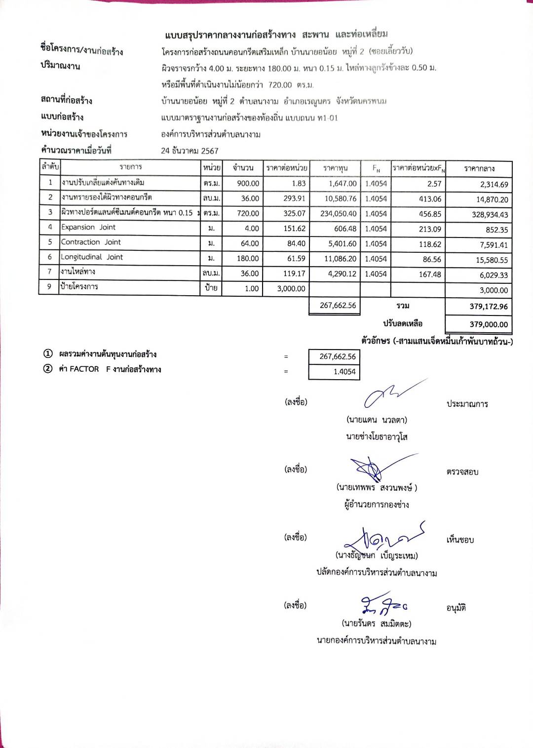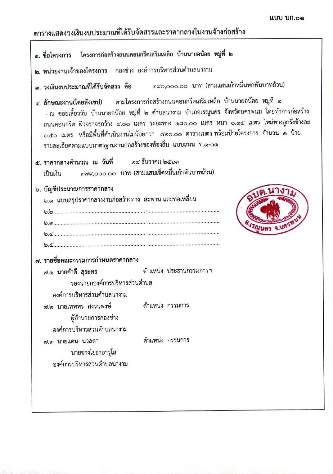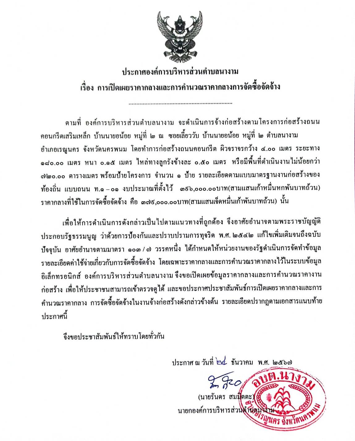 ชื่อเรื่อง : ประชาสัมพันธ์การเปิดเผยราคากลางจ้างก่อสร้างตามโครงการก่อสร้างถนนคอนกรีตเสริมเหล็ก บ้านนายอน้อย หมู่ที่ ๒ โดยวิธีเฉพาะเจาะจง
