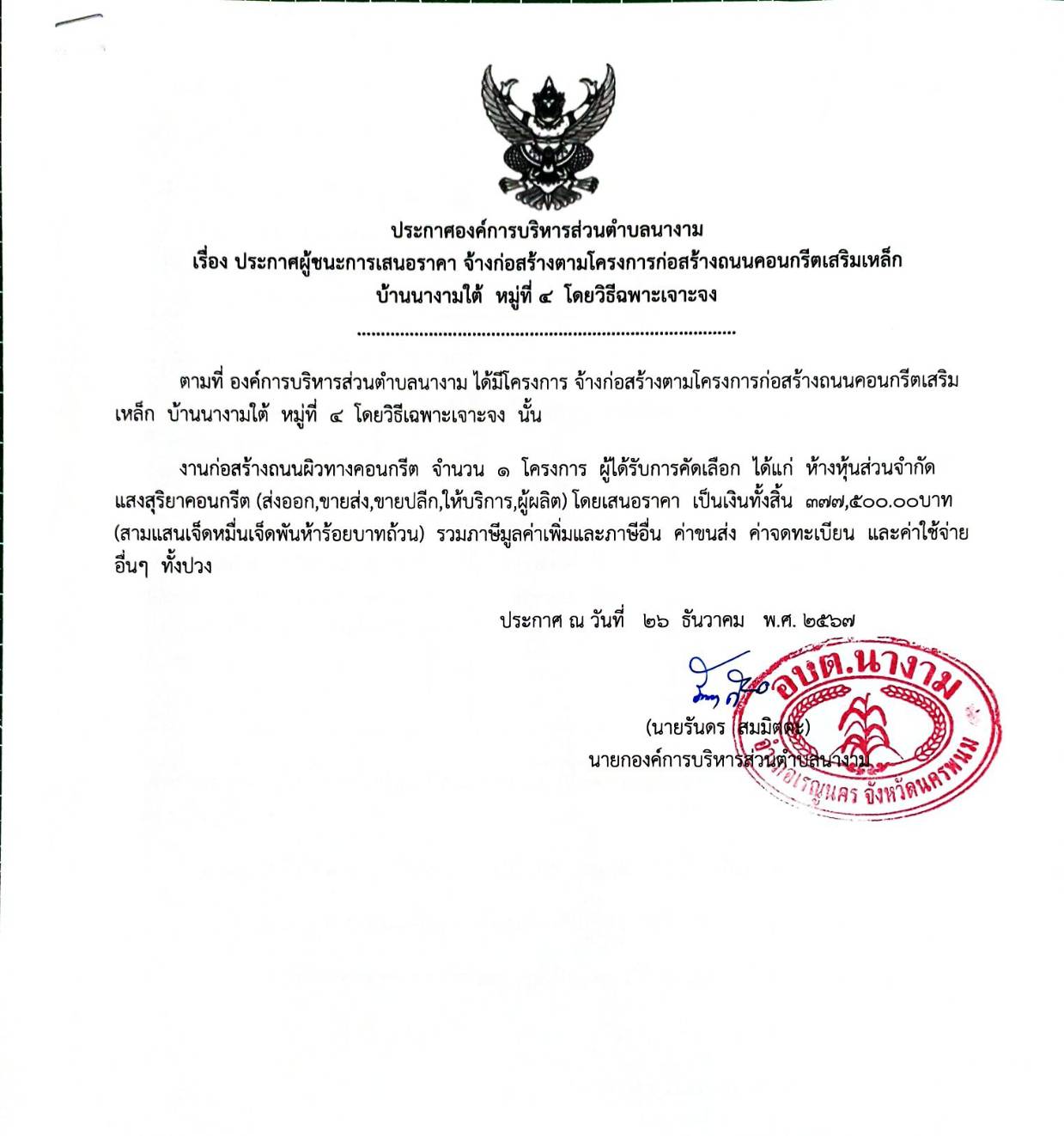 ประกาศผู้ชนะการเสนอราคา จ้างก่อสร้างตามโครงการก่อสร้างถนนคอนกรีตเสริมเหล็ก บ้านนางามใต้ หมู่ที่ ๔ โดยวิธีเฉพาะเจาะจง