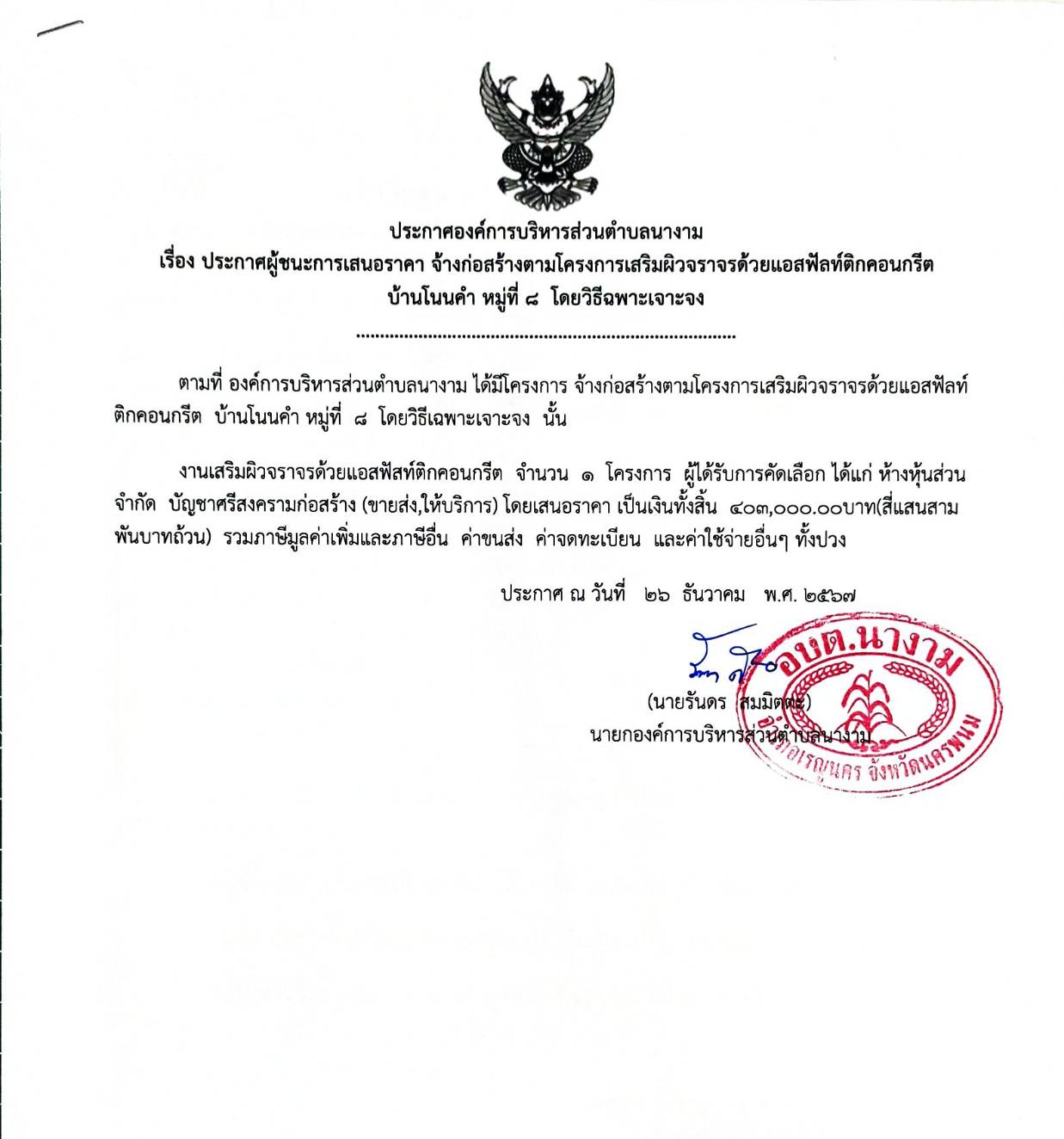 ชื่อเรื่อง : ประกาศผู้ชนะการเสนอราคา จ้างก่อสร้างตามโครงการเสริมผิวจราจรด้วยแอสฟัลท์ติกคอนกรีต บ้านโนนคำ หมู่ที่ ๘ โดยวิธีเฉพาะเจาะจง