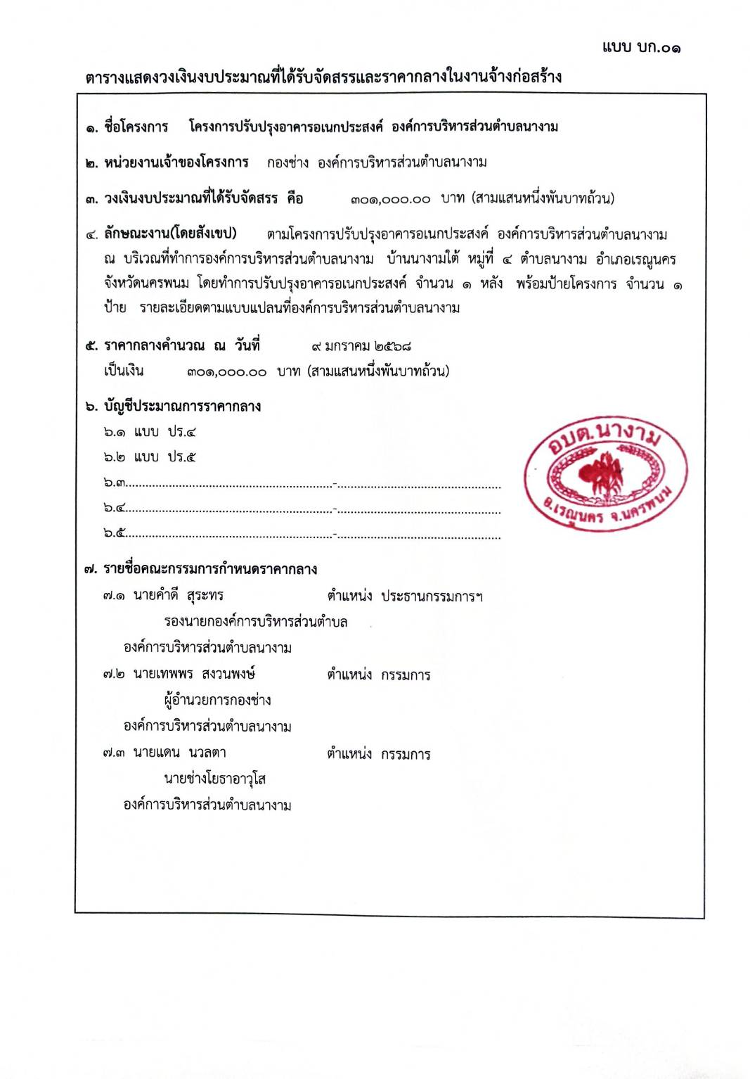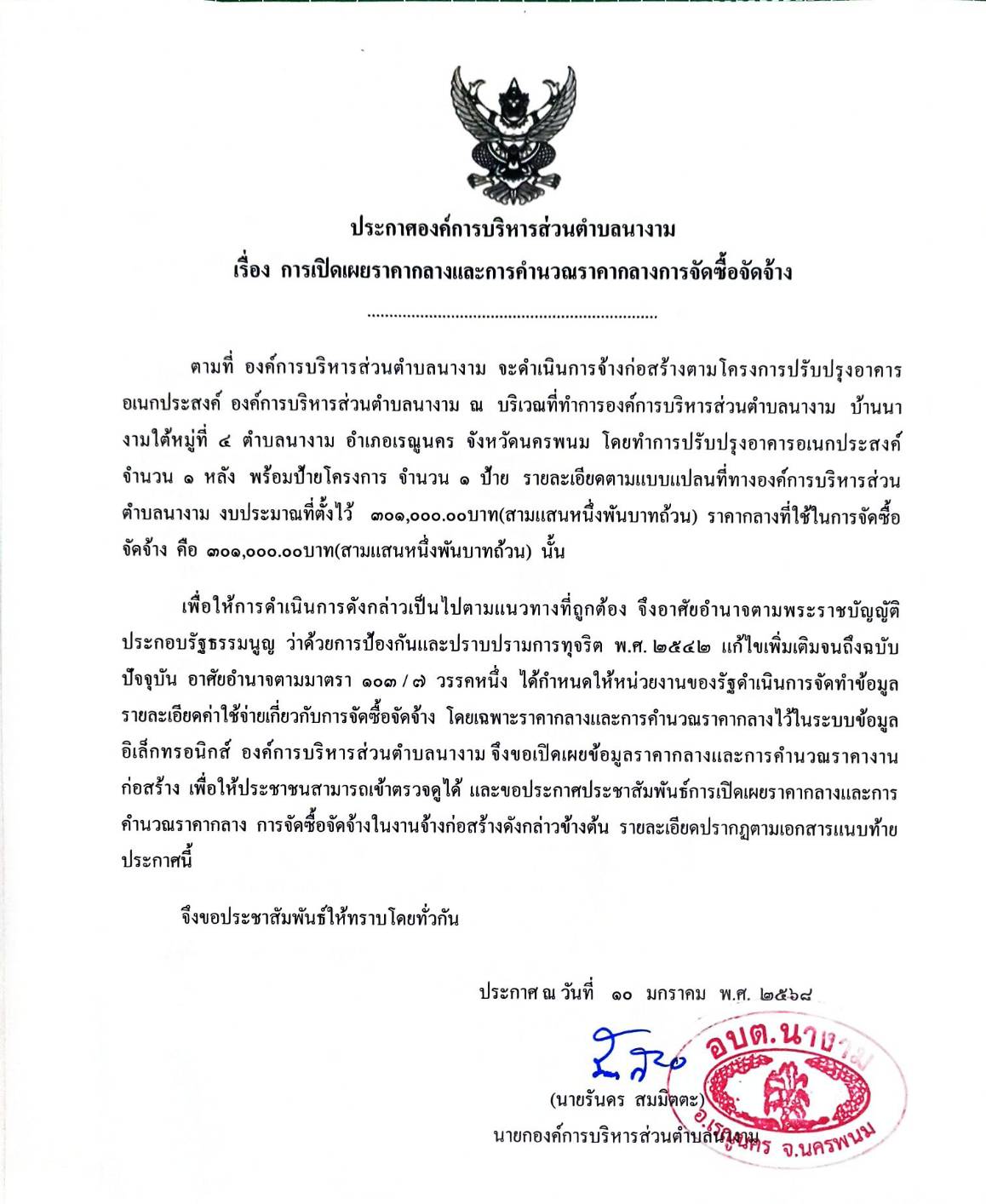 ประชาสัมพันธ์การเปิดเผยราคากลางจ้างก่อสร้างตามโครงการปรับปรุงอาคารอเนกประสงค์ องค์การบริหารส่วนตำบลนางาม โดยวิธีเฉพาะเจาะจง