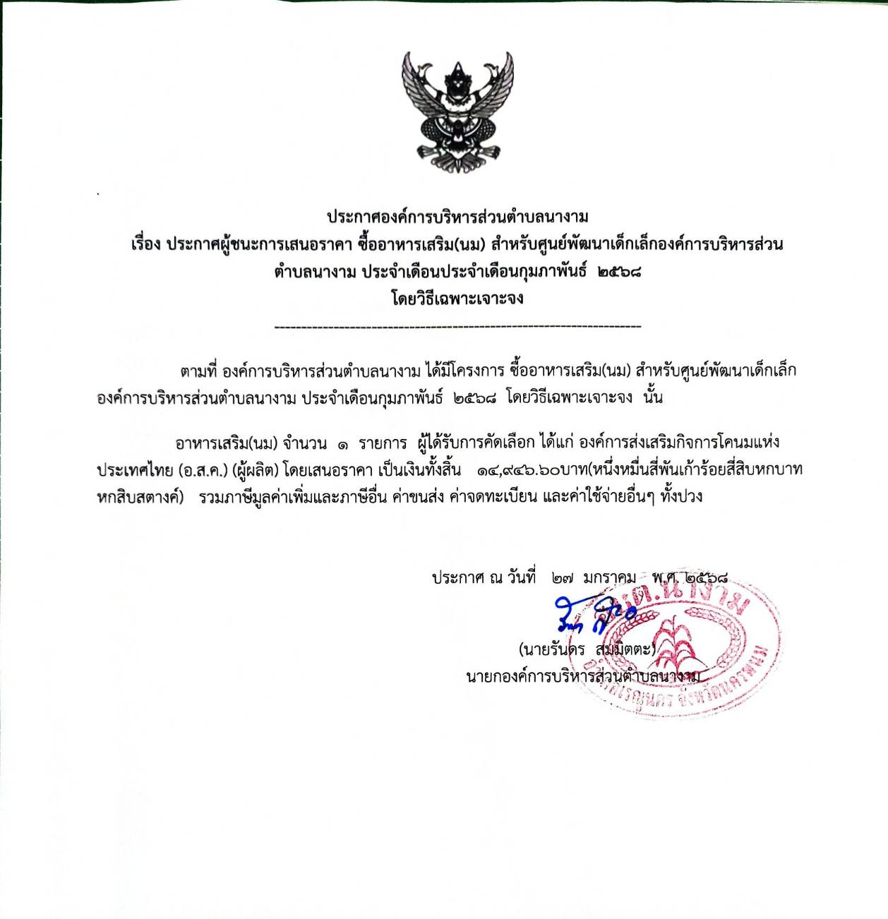 ประกาศผู้ชนะการเสนอราคา ซื้ออาหารเสริม(นม) สำหรับศูนย์พัฒนาเด็กเล็กองค์การบริหารส่วนตำบลนางาม ประจำเดือนกุมภาพันธ์ ๒๕๖๘ โดยวิธีเฉพาะเจาะจง