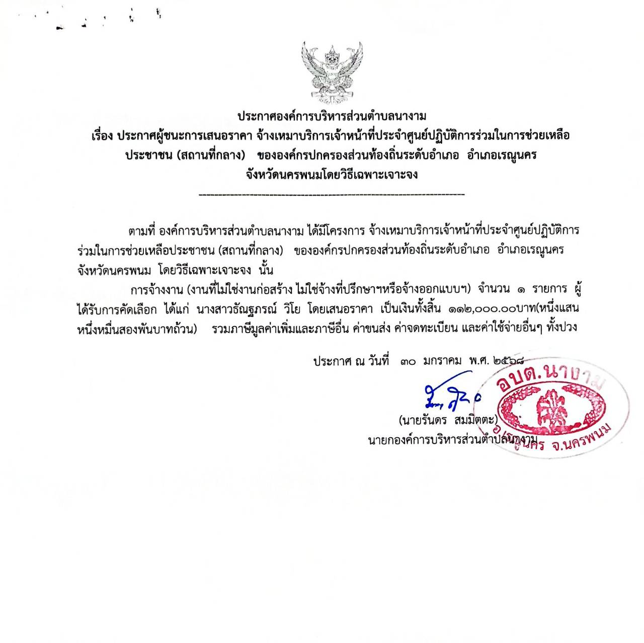ชื่อเรื่อง : ประกาศผู้ชนะการเสนอราคา จ้างเหมาบริการเจ้าหน้าที่ประจำศูนย์ปฏิบัติการร่วมในการช่วยเหลือประชาชน (สถานที่กลาง) ขององค์กรปกครองส่วนท้องถิ่นระดับอำเภอ อำเภอเรณูนคร จังหวัดนครพนม โดยวิธีเฉพาะเจาะจง