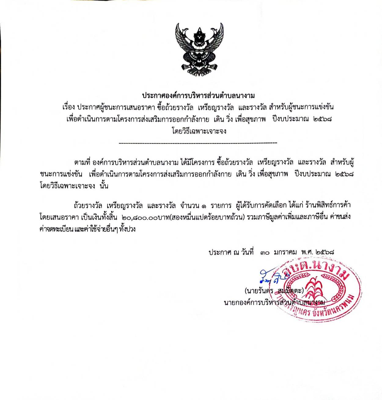 ชื่อเรื่อง : ประกาศผู้ชนะการเสนอราคา ซื้อถ้วยรางวัล เหรียญรางวัล และรางวัล สำหรับผู้ชนะการแข่งขัน เพื่อดำเนินการตามโครงการส่งเสริมการออกกำลังกาย เดิน วิ่ง เพื่อสุขภาพ ปีงบประมาณ ๒๕๖๘ โดยวิธีเฉพาะเจาะจง