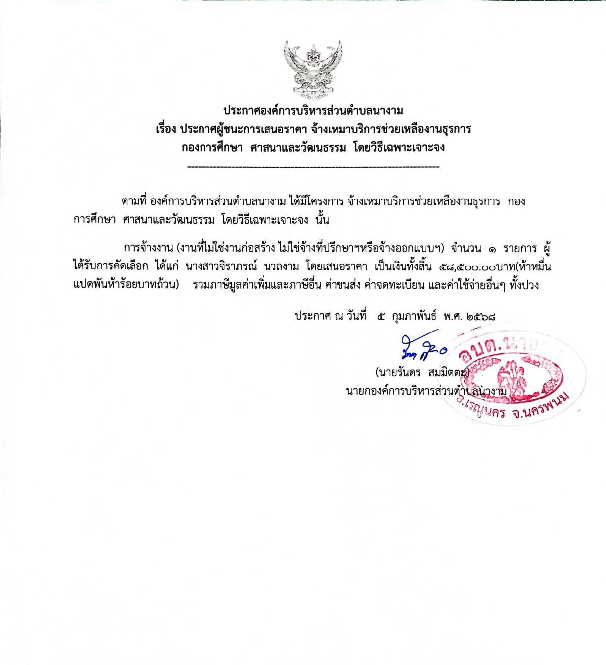 ประกาศผู้ชนะการเสนอราคา จ้างเหมาบริการช่วยเหลืองานธุรการ กองการศึกษา ศาสนาและวัฒนธรรม โดยวิธีเฉพาะเจาะจง
