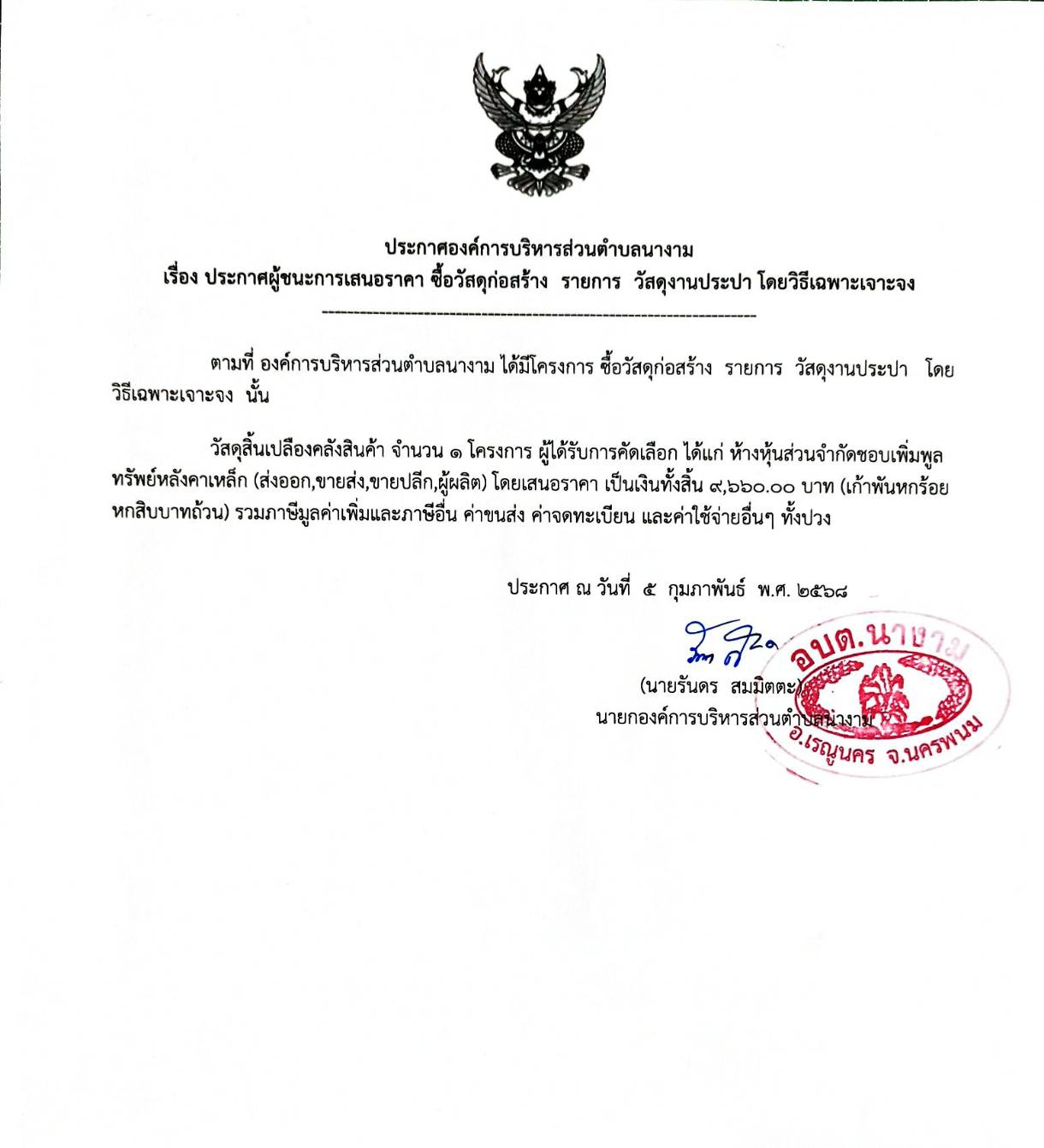 ประกาศผู้ชนะการเสนอราคา ซื้อวัสดุก่อสร้าง รายการ วัสดุงานประปา โดยวิธีเฉพาะเจาะจง