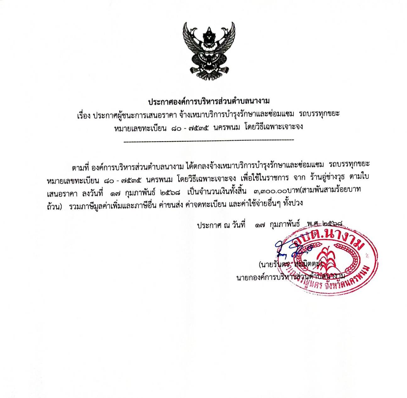 ประกาศผู้ชนะการเสนอราคา จ้างเหมาบริการบำรุงรักษาและซ่อมแซม รถบรรทุกขยะ หมายเลขทะเบียน ๘๐ - ๗๕๓๕ นครพนม โดยวิธีเฉพาะเจาะจง