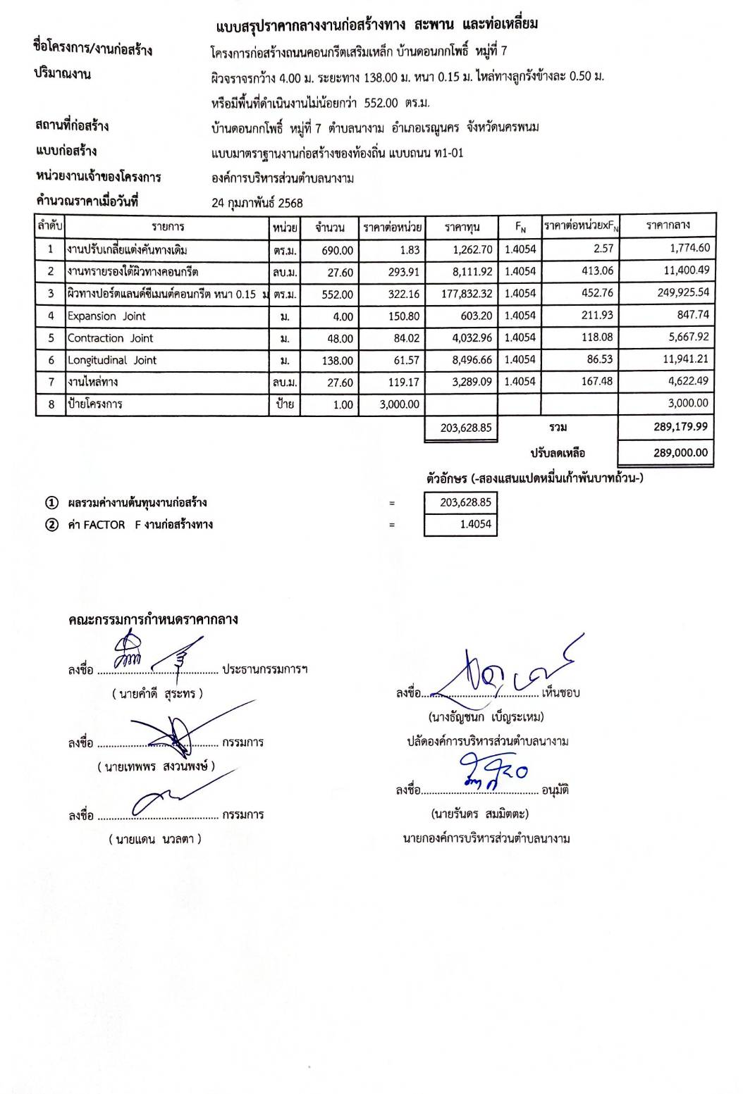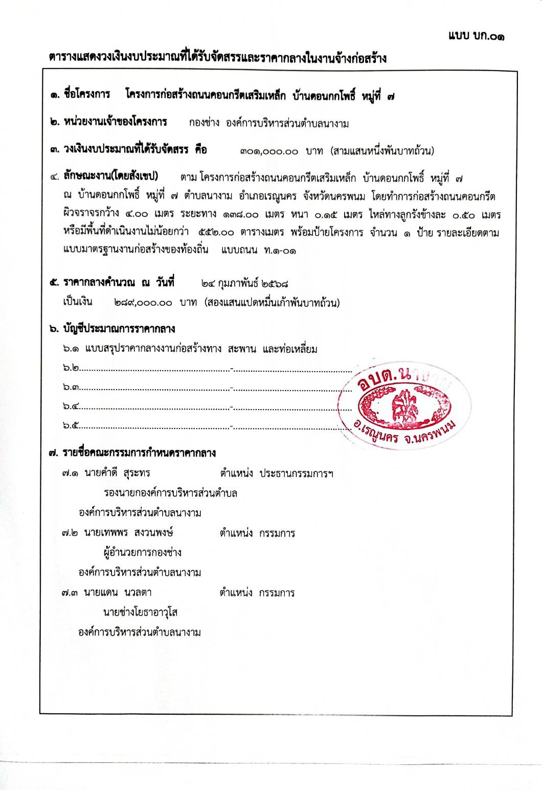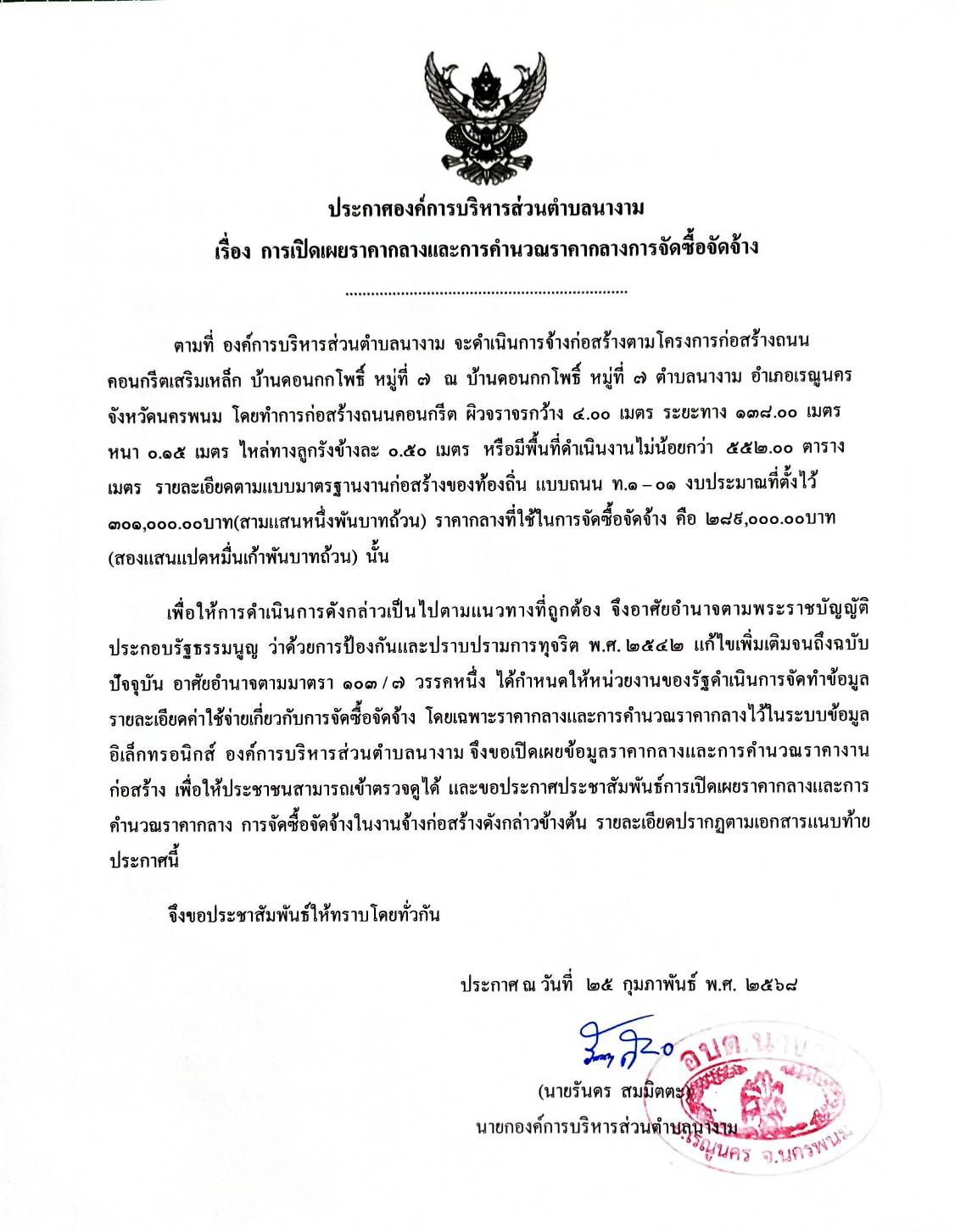 ประชาสัมพันธ์การเปิดเผยราคากลางจ้างตามโครงการก่อสร้างถนนคอนกรีตเสริมเหล็ก บ้านดอนกกโพธิ์ หมู่ที่ ๗ โดยวิธีเฉพาะเจาะจง