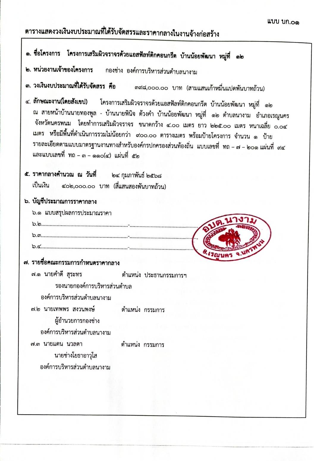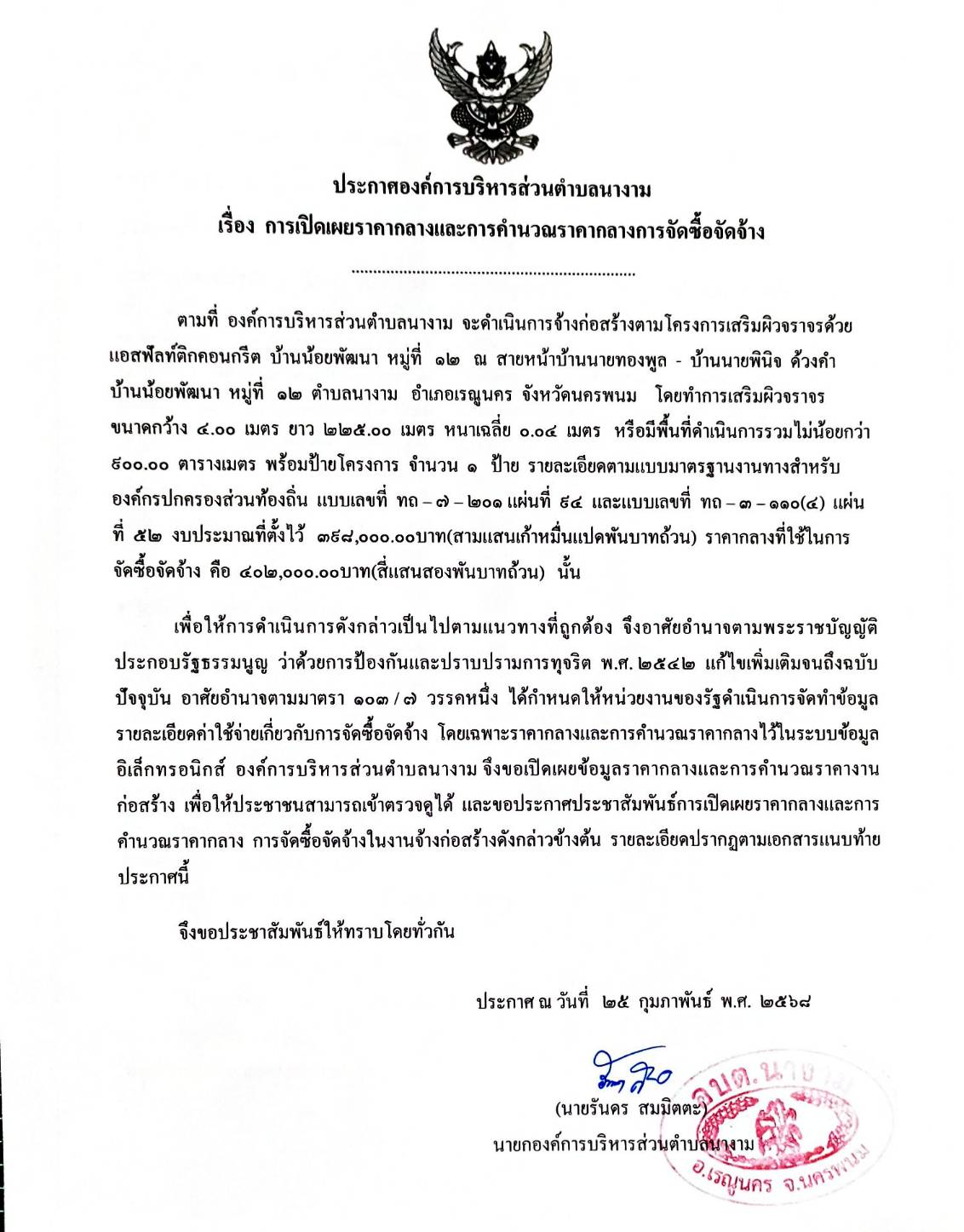 ประชาสัมพันธ์การเปิดเผยราคากลางจ้างตามโครงการเสริมผิวจราจรด้วยแอสฟัลท์ติกคอนกรีต บ้านน้อยพัฒนา หมู่ที่ ๑๒ โดยวิธีเฉพาะเจาะจง