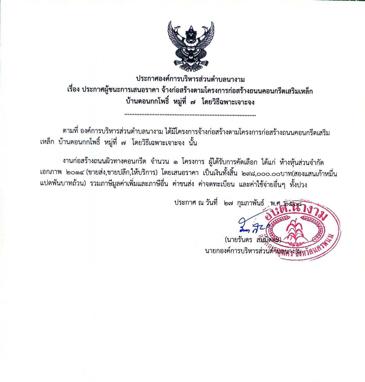 ประกาศผู้ชนะการเสนอราคา จ้างก่อสร้างตามโครงการก่อสร้างถนนคอนกรีตเสริมเหล็ก บ้านดอนกกโพธิ์ หมู่ที่ ๗ โดยวิธีเฉพาะเจาะจง