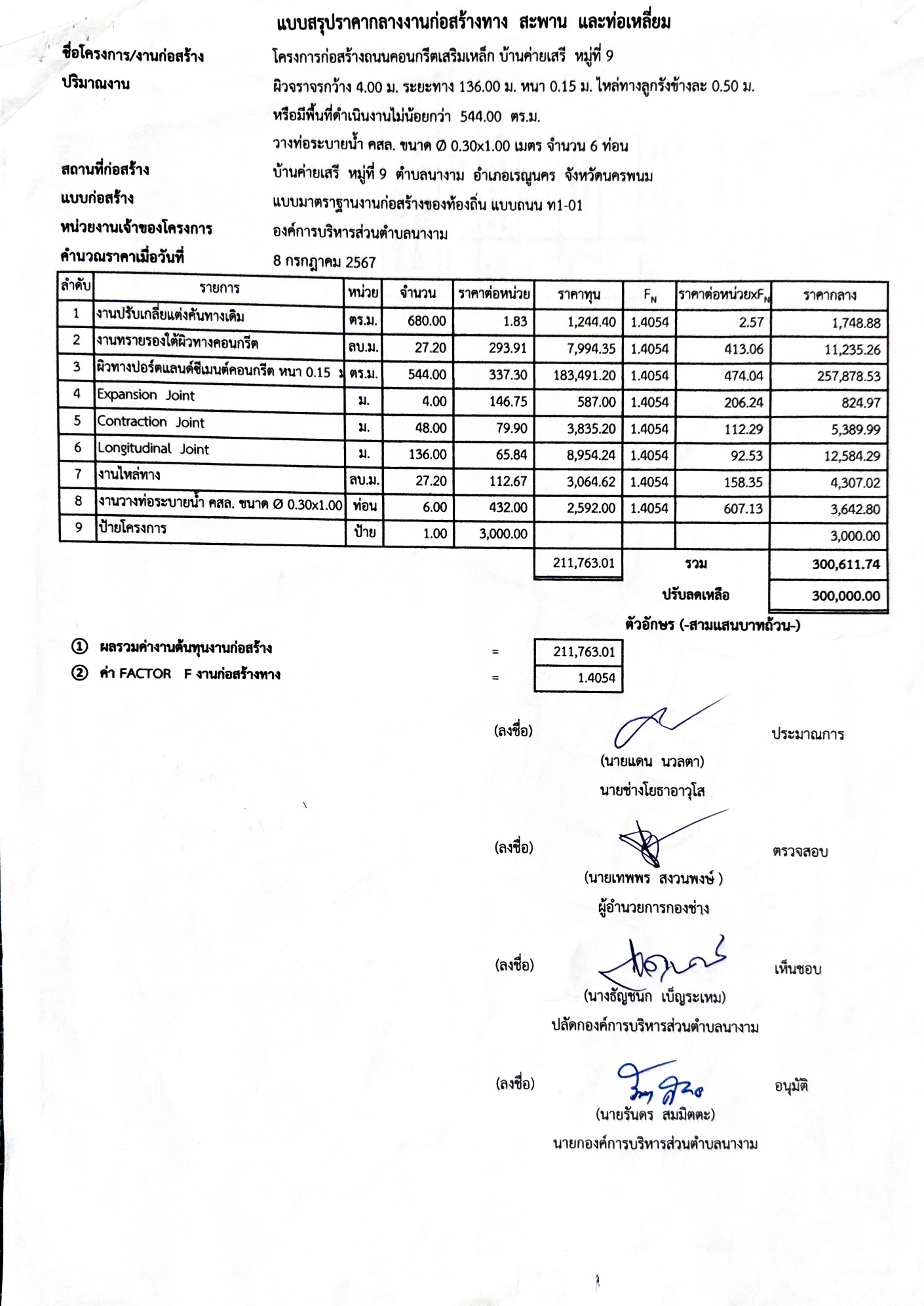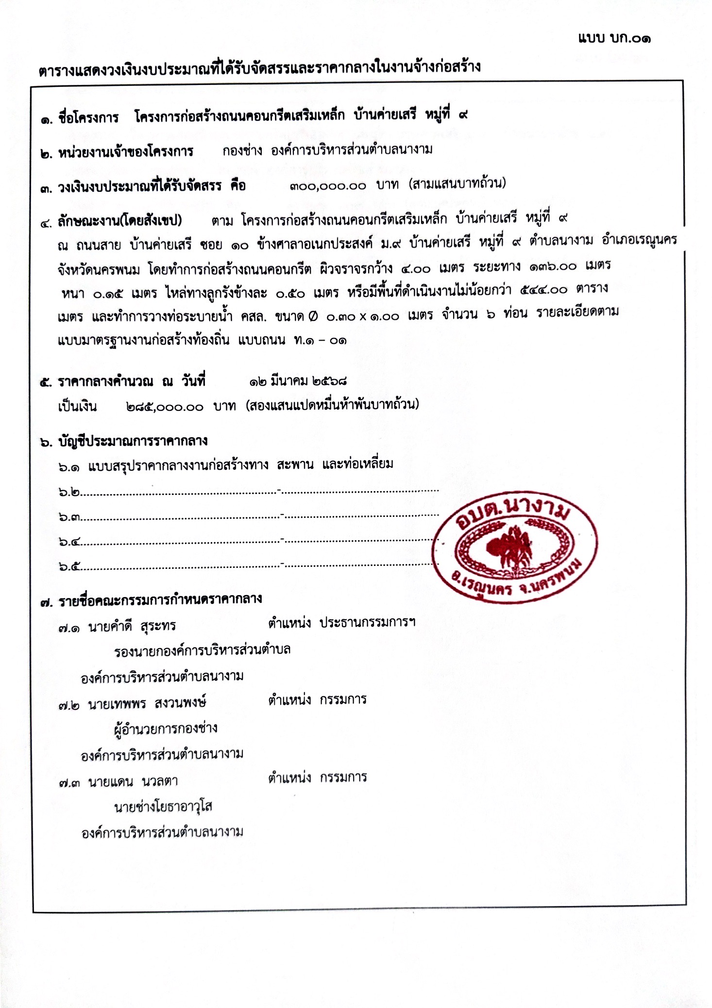 ชื่อเรื่อง : ประชาสัมพันธ์การเปิดเผยราคากลางจ้างตามโครงการก่อสร้างถนนคอนกรีตเสริมเหล็ก บ้านค่ายเสรี หมู่ที่ 9 โดยวิธีเฉพาะเจาะจง