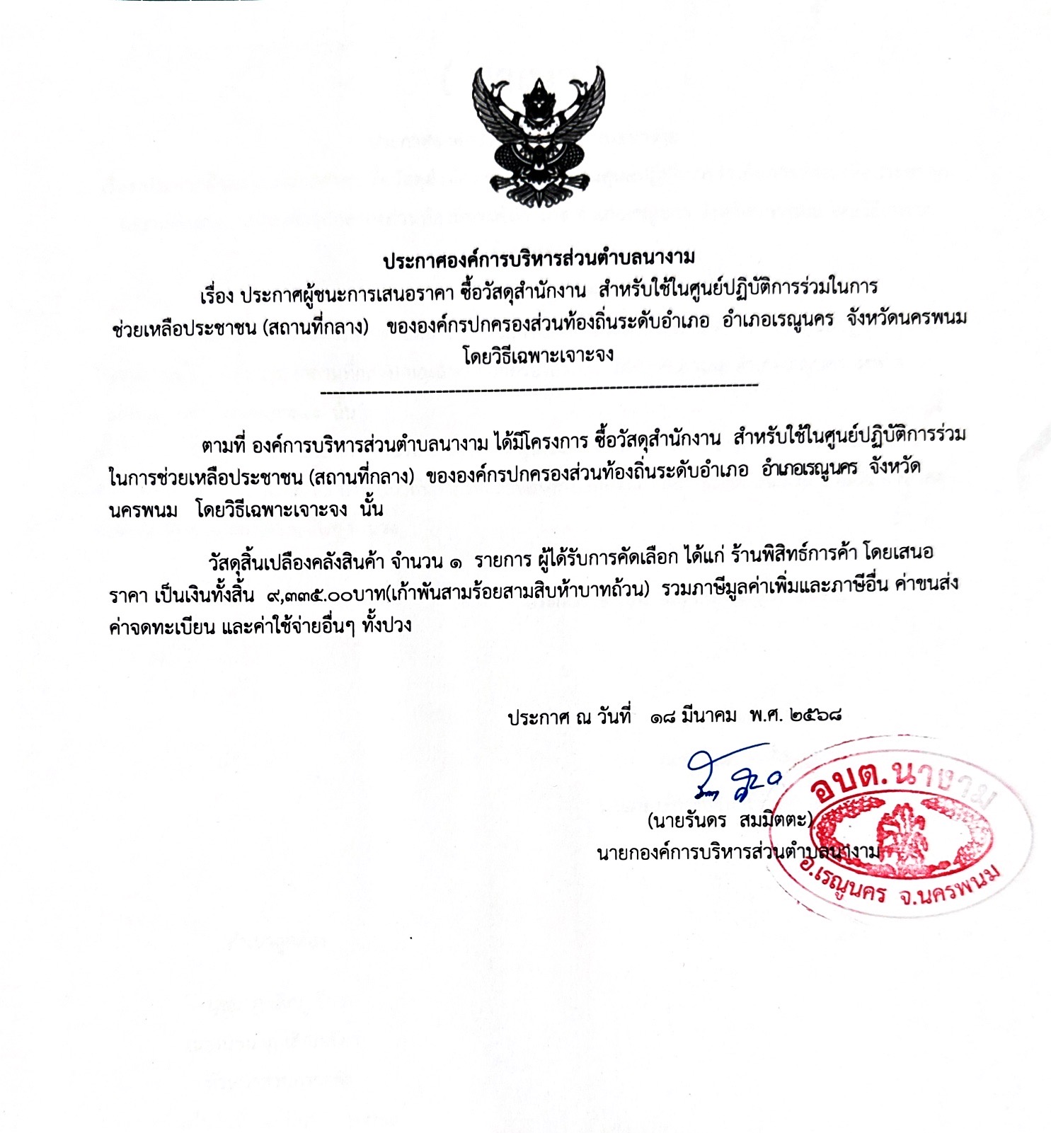 ชื่อเรื่อง : ประกาศผู้ชนะการเสนอราคา ซื้อวัสดุสำนักงาน สำหรับใช้ในศูนย์ปฏิบัติการร่วมในการช่วยเหลือประชาชน (สถานที่กลาง) ขององค์กรปกครองส่วนท้องถิ่นระดับอำเภอ อำเภอเรณูนคร จังหวัดนครพนม โดยวิธีเฉพาะเจาะจง