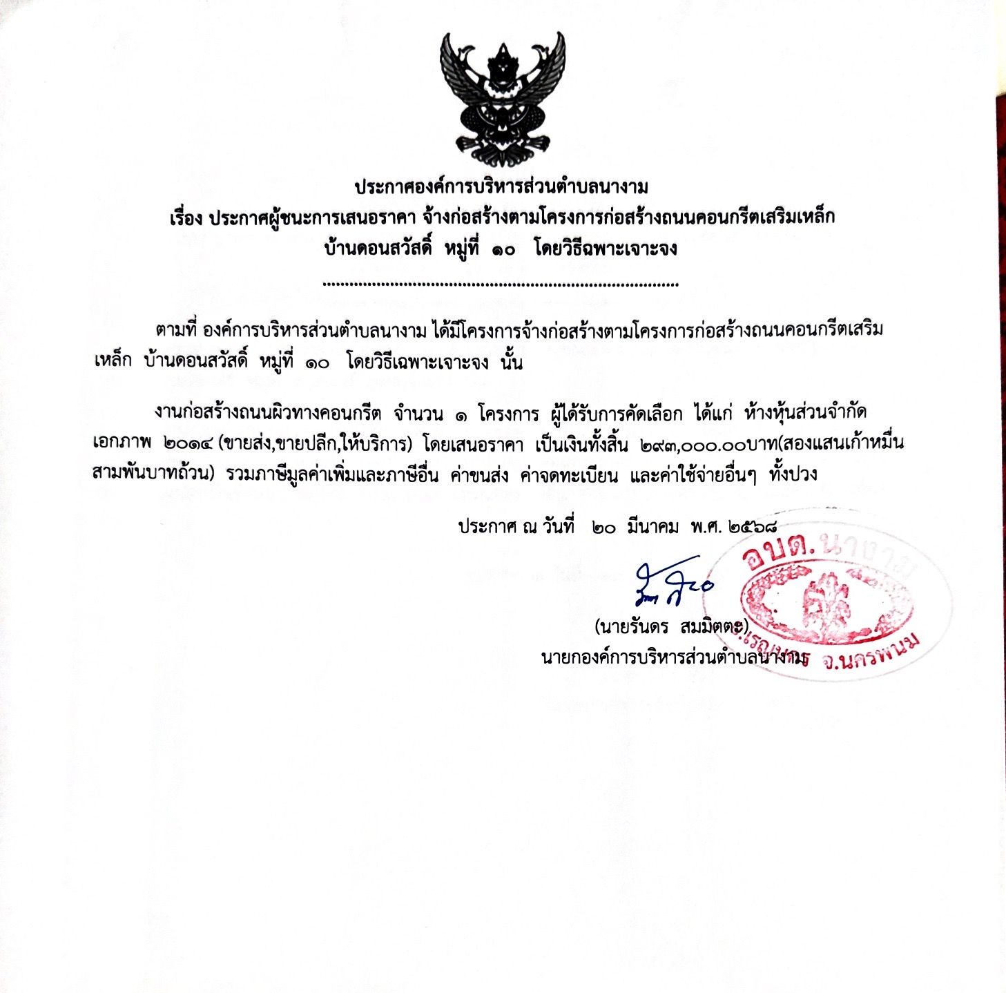 ชื่อเรื่อง : ประกาศผู้ชนะการเสนอราคา จ้างก่อสร้างตามโครงการก่อสร้างถนนคอนกรีตเสริมเหล็ก บ้านดอนสวัสดิ์ หมู่ที่ 10 โดยวิธีเฉพาะเจาะจง