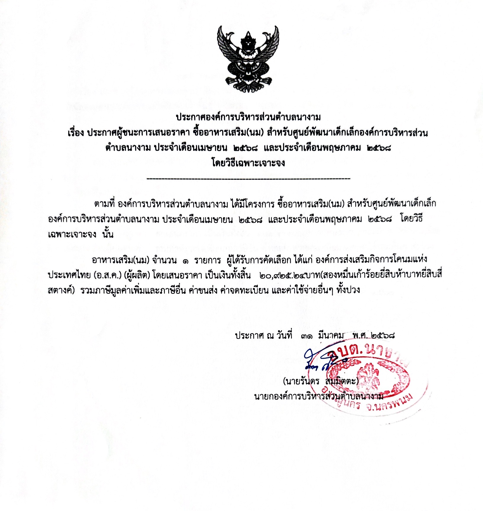ประกาศผู้ชนะการเสนอราคา ซื้ออาหารเสริม(นม) สำหรับศูนย์พัฒนาเด็กเล็กองค์การบริหารส่วนตำบลนางาม ประจำเดือนเมษายน ๒๕๖๘ และประจำเดือนพฤษภาคม ๒๕๖๘ โดยวิธีเฉพาะเจาะจง