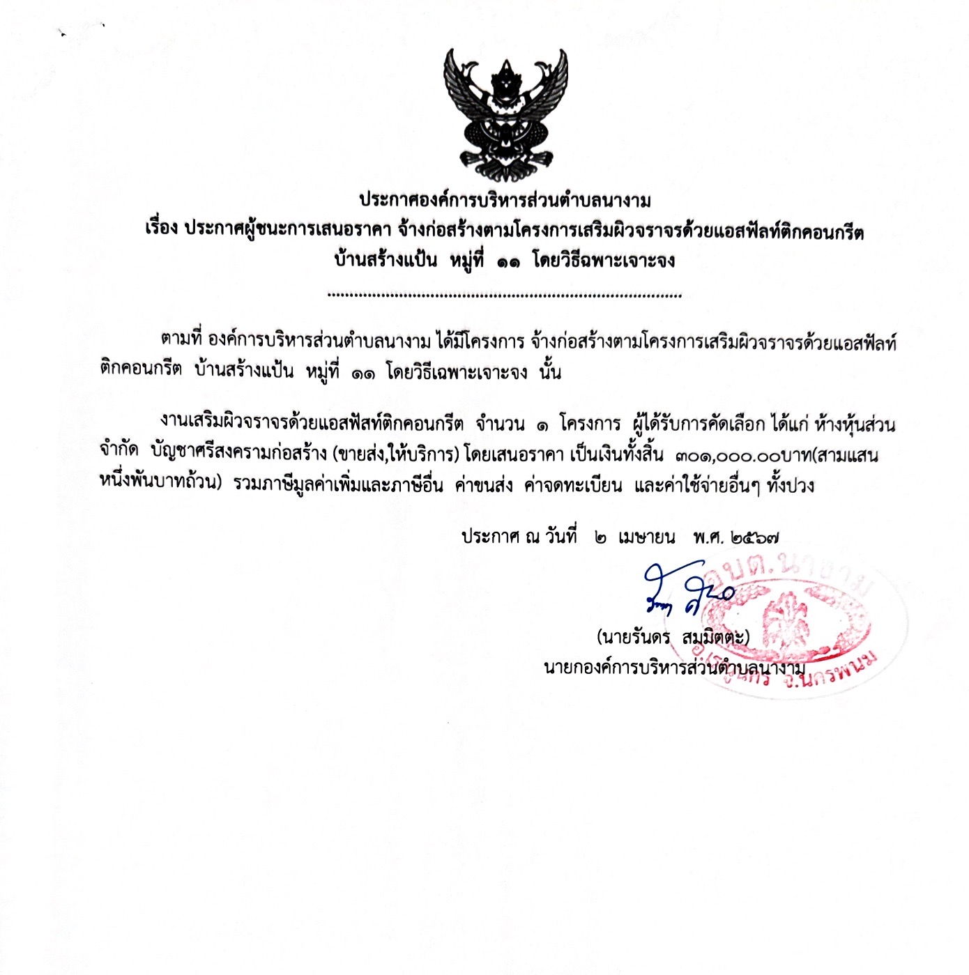 ชื่อเรื่อง : ประกาศผู้ชนะการเสนอราคา จ้างตามโครงการเสริมผิว จราจรด้วยแอสฟัลท์ติกคอนกรีต บ้านสร้างแป้น หมู่ที่ 11 โดยวิธีเฉพาะเจาะจง