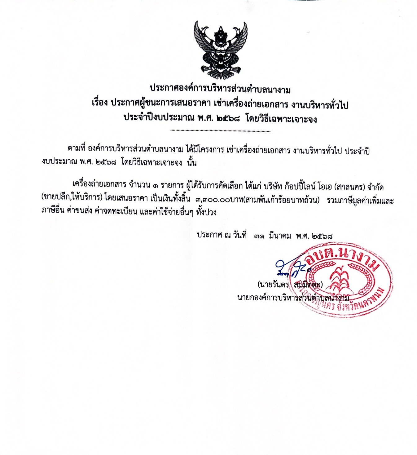 ประกาศผู้ชนะการเสนอราคา เช่าเครื่องถ่ายเอกสาร งานบริหารทั่วไป ประจำปีงบประมาณ พ.ศ. ๒๕๖๘ โดยวิธีเฉพาะเจาะจง