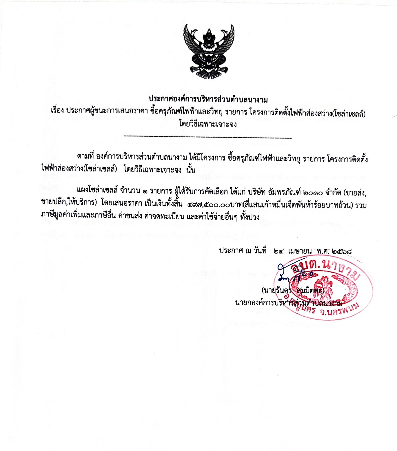 ประกาศผู้ชนะการเสนอราคา ซื้อครุภัณฑ์ไฟฟ้าและวิทยุ รายการ โครงการติดตั้งไฟฟ้าส่องสว่าง(โซล่าเซลล์) โดยวิธีเฉพาะเจาะจง