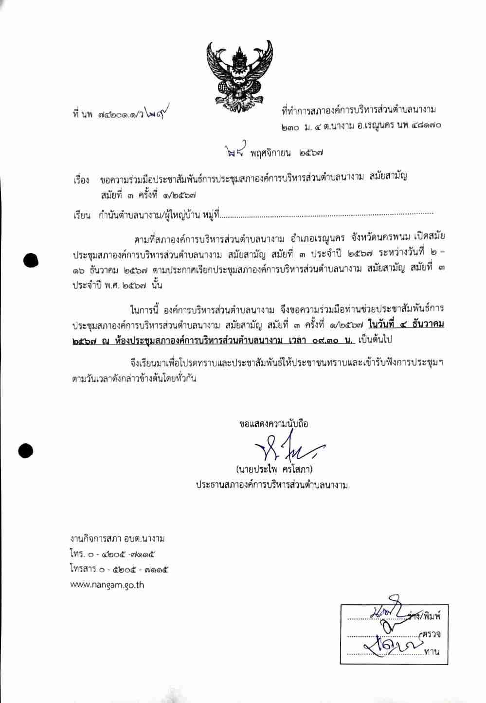 ขอความร่วมมือประชาสัมพันธ์การประชุมสภาองค์การบริหารส่วนตำบลนางาม สมัยสามัญ สมัยที่3 ครั้งที่ 1/2567