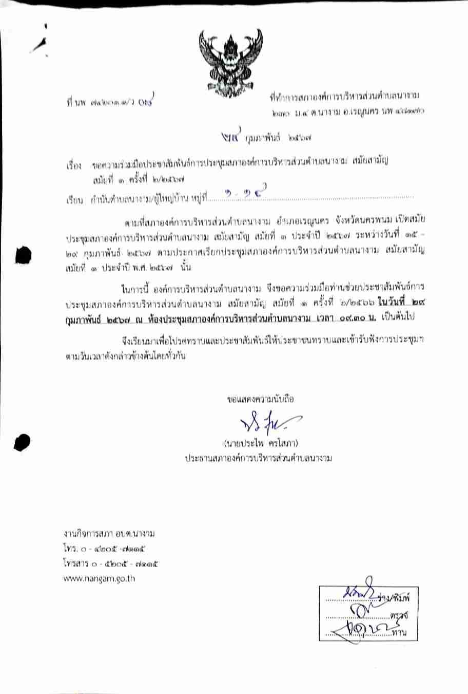 ชื่อเรื่อง : ขอความร่วมมือประชาสัมพันธ์การประชุมสภาองค์การบริหารส่วนตำบลนางาม สมัยสามัญ สมัยที่1 ครั้งที่ 2/2567