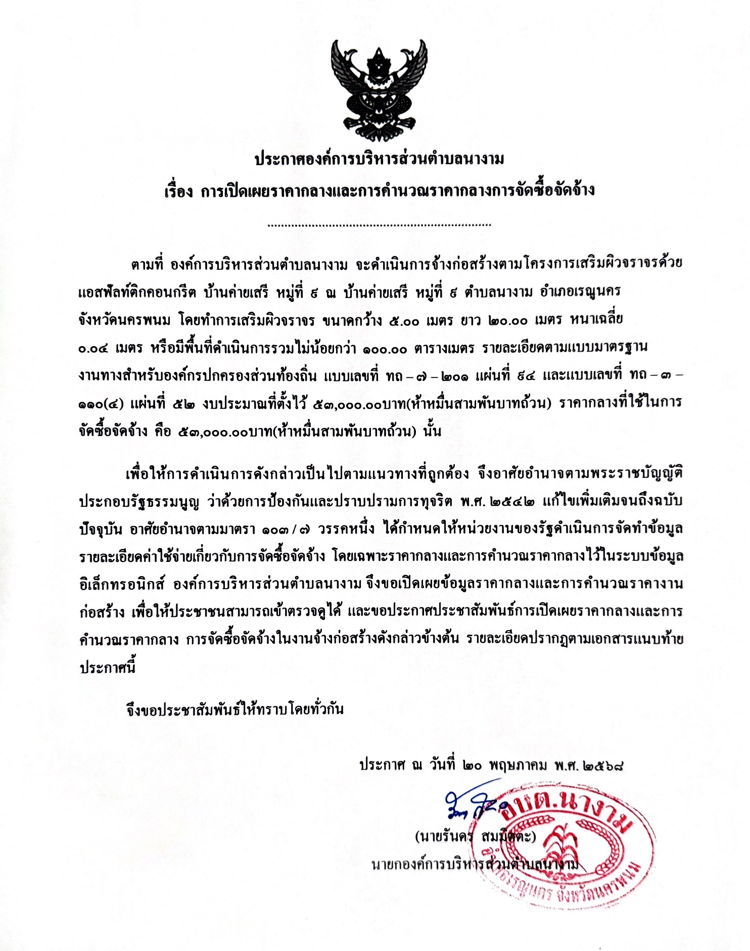ชื่อเรื่อง : ประชาสัมพันธ์การเปิดเผยราคากลาง จ้างตามโครงการเสริมผิวจราจรด้วยแอสฟัลท์ติกคอนกรีต บ้านค่ายเสรี หมู่ที่ 9