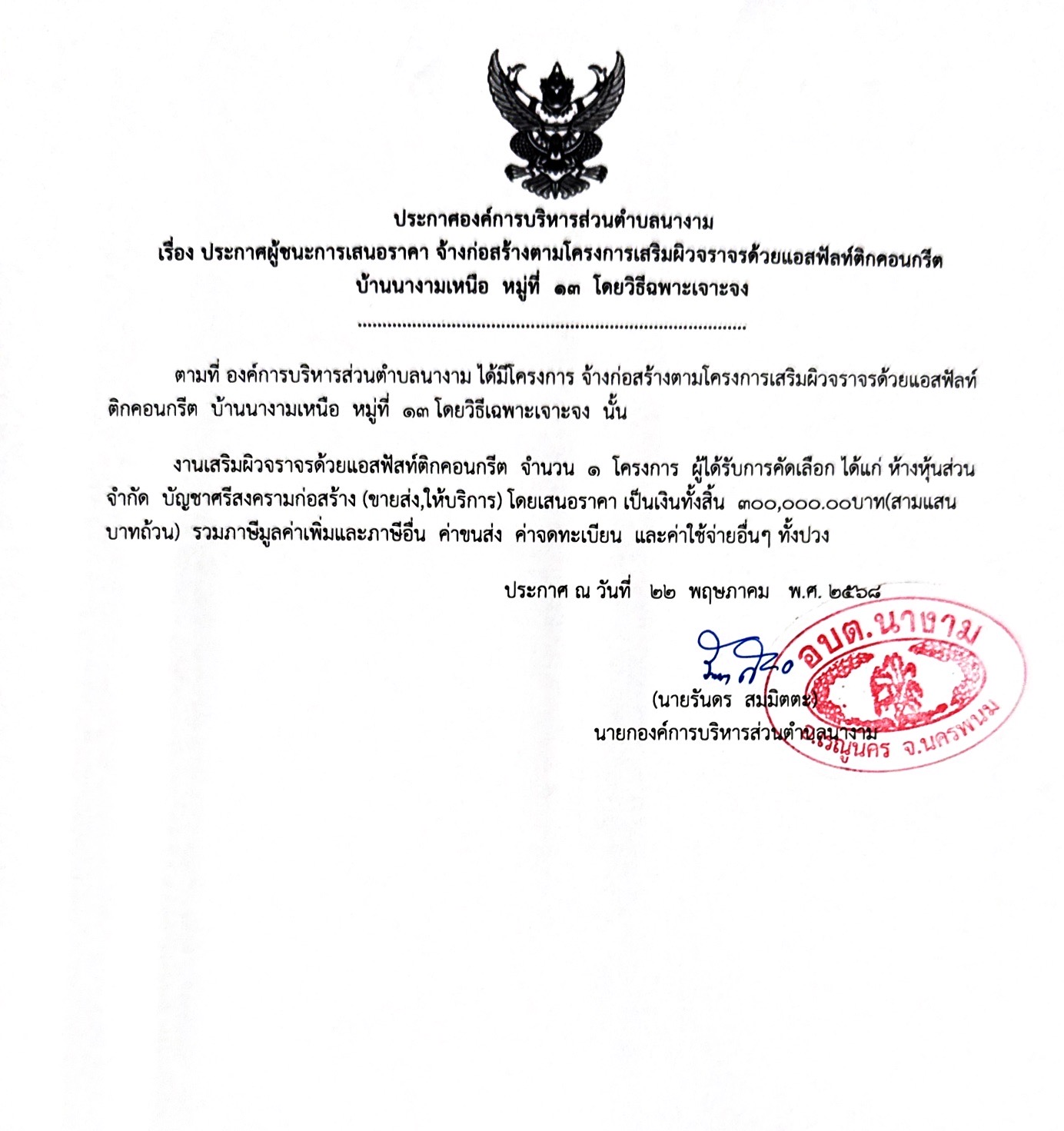 ประกาศผู้ชนะการเสนอราคา จ้างตามโครงการเสริมผิวจราจรด้วยแอสฟัลท์ติกคอนกรีต บ้านนางามเหนือ หมู่ที่ ๑๓ โดยวิธีเฉพาะเจาะจง