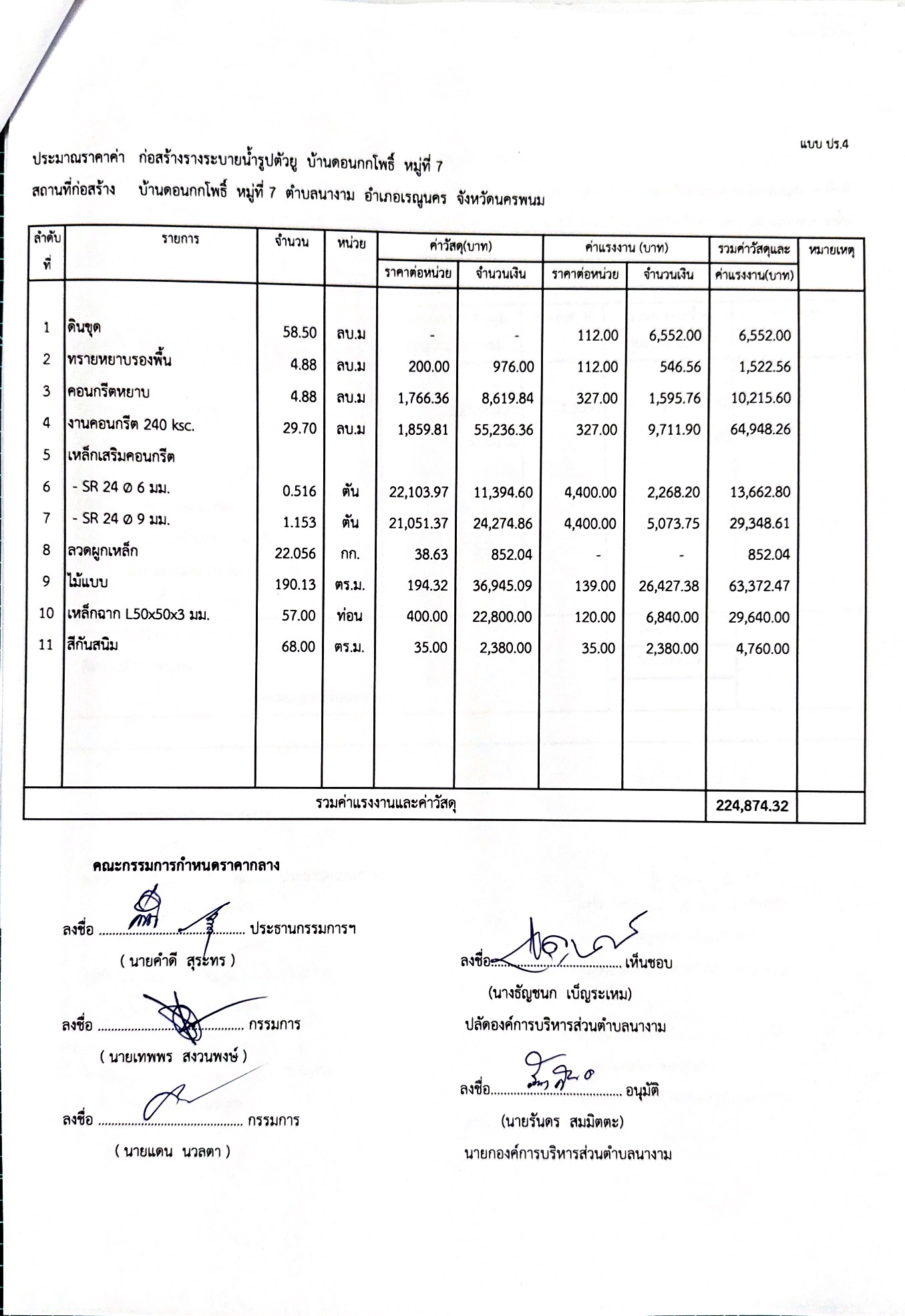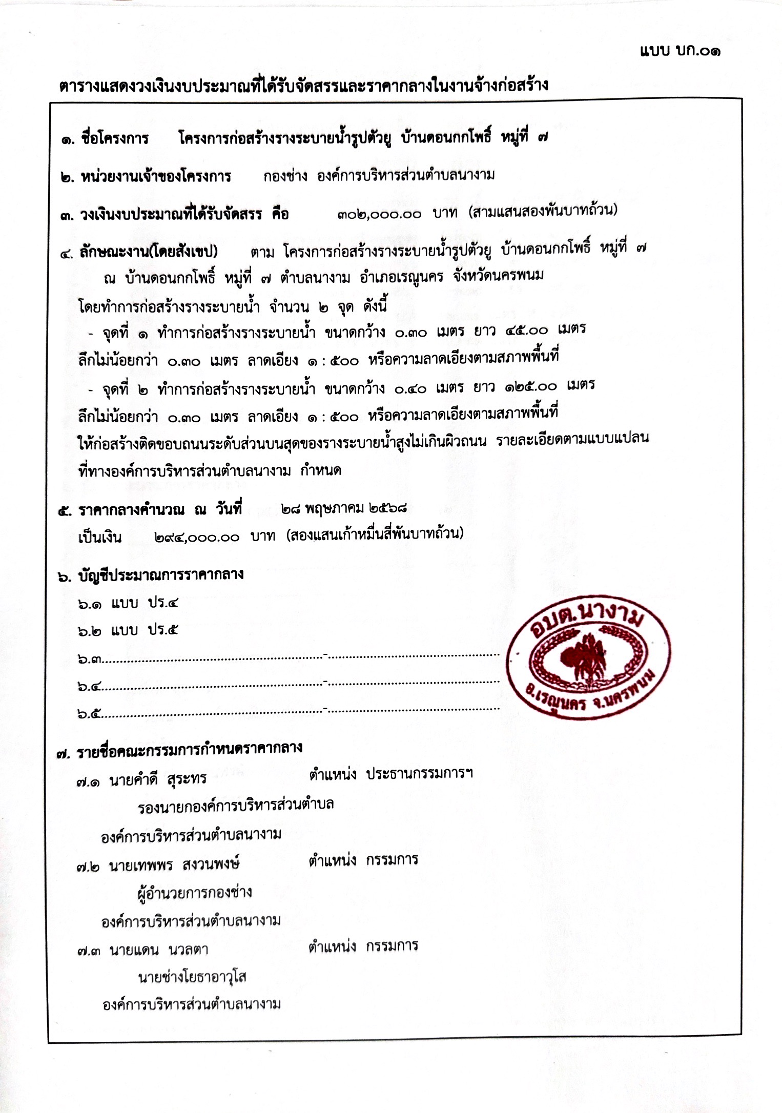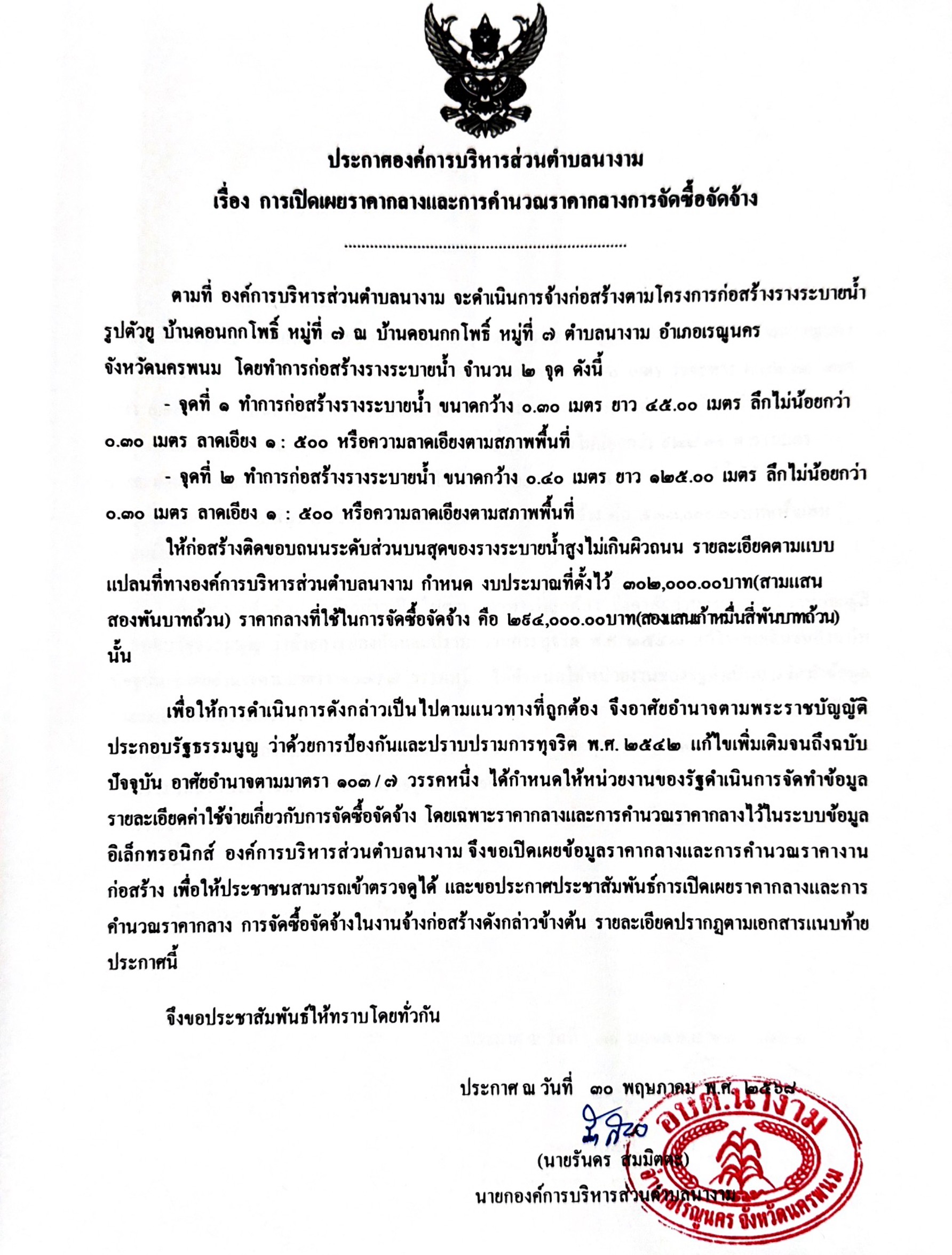 ประชาสัมพันธ์การเปิดเผยราคากลาง จ้างตามโครงการก่อสร้างรางระบายน้ำรูปตัวยู บ้านดอนกกโพธิ์ หมู่ที่ ๗