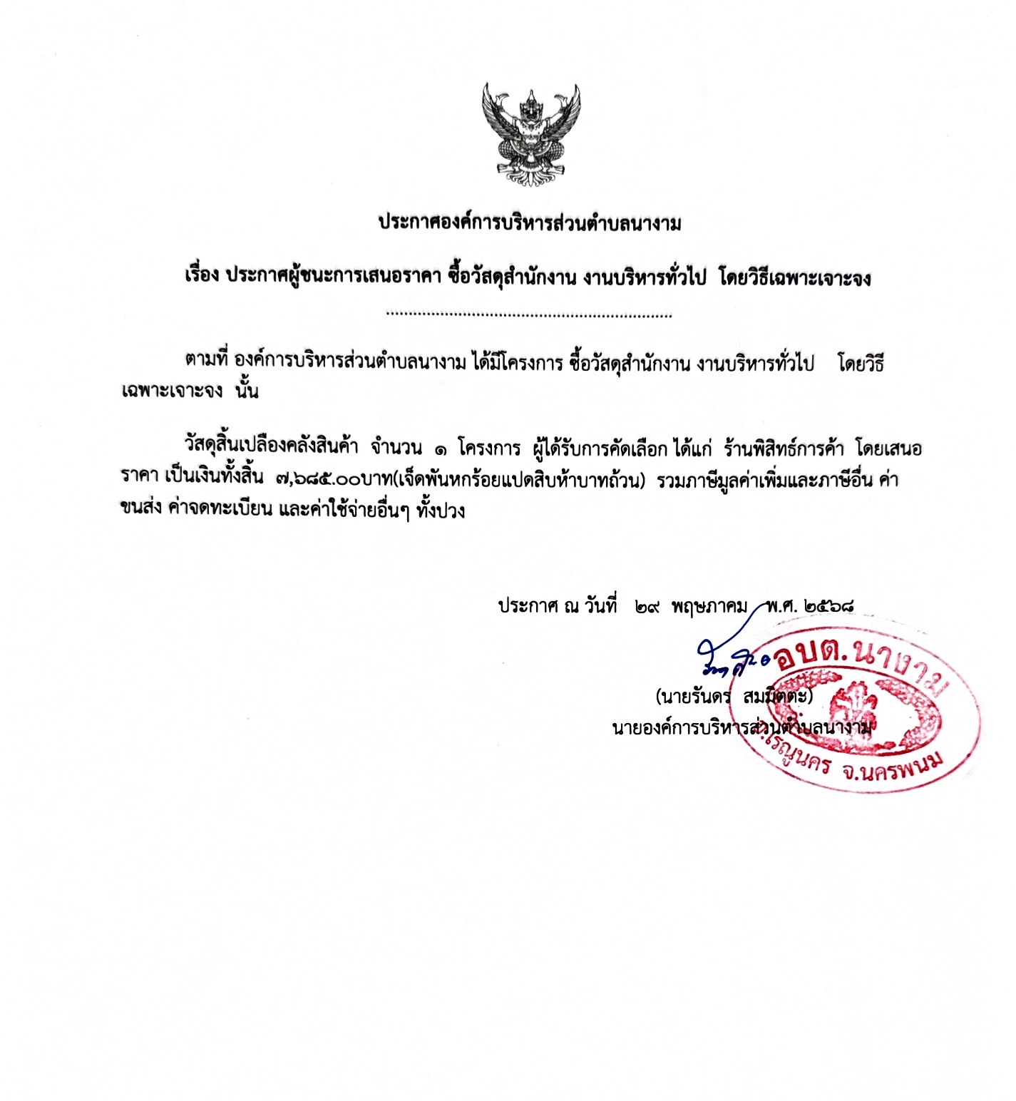 ชื่อเรื่อง : ประกาศผู้ชนะการเสนอราคา ซื้อวัสดุสำนักงาน งานบริหารทั่วไป โดยวิธีเฉพาะเจาะจง