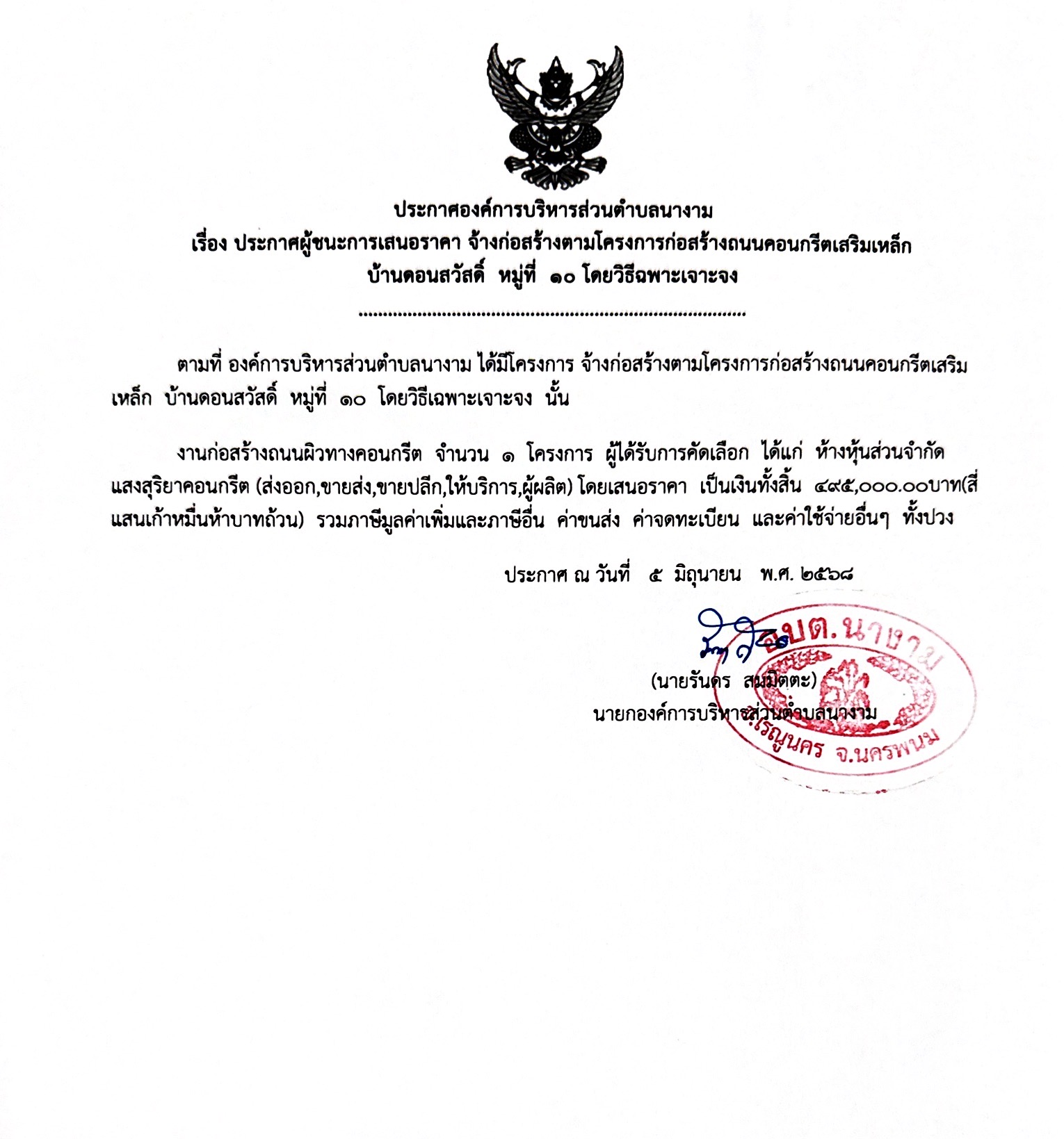 ชื่อเรื่อง : ประกาศผู้ชนะการเสนอราคา จ้างตามโครงการก่อสร้างถนนคอนกรีตเสริมเหล็ก บ้านดอนสวัสดิ์ หมู่ที่ 10 โดยวิธีเฉพาะเจาะจง