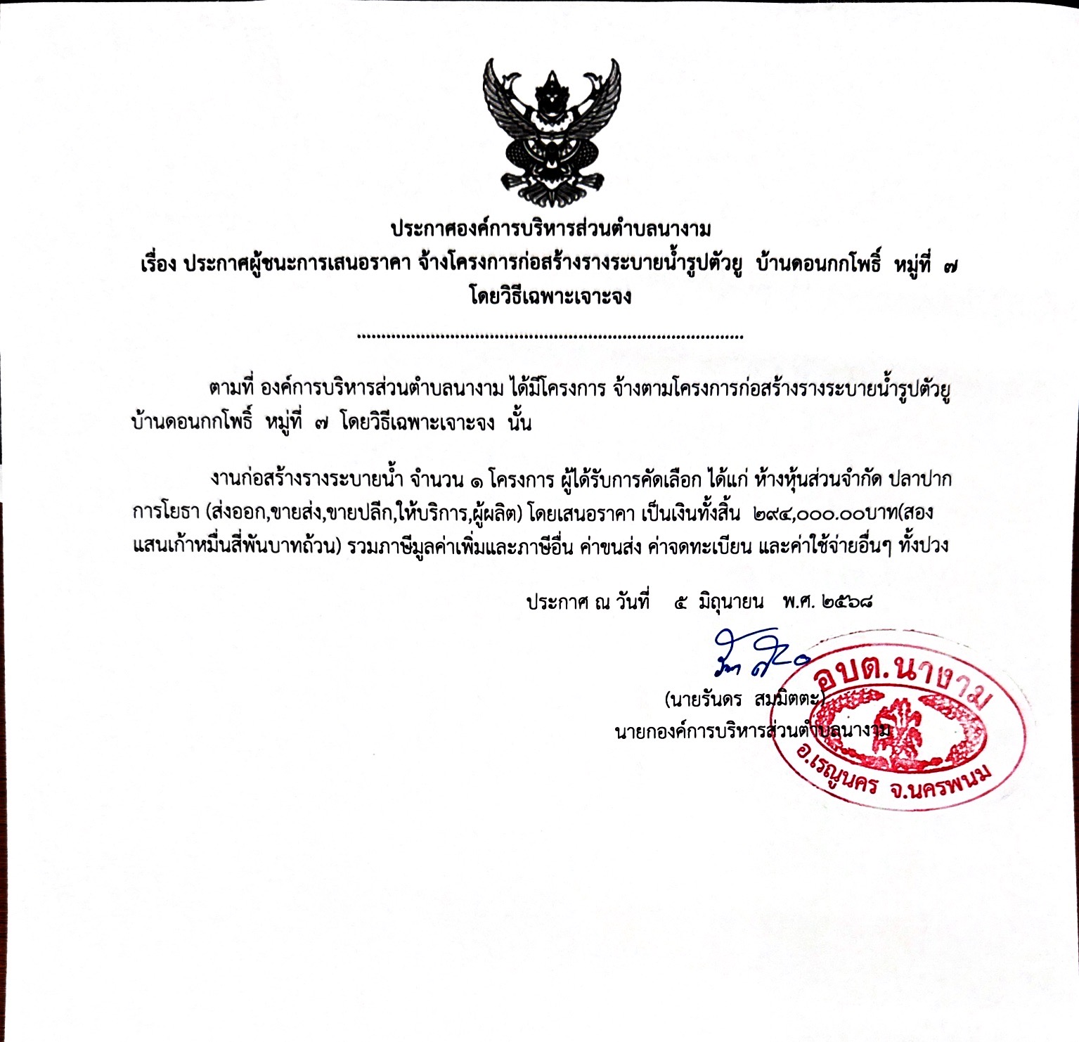 ประกาศผู้ชนะการเสนอราคา จ้างตามโครงการก่อสร้างรางระบายน้ำรูปตัวยู บ้านดอนกกโพธิ์ หมู่ที่ 7 โดยวิธีเฉพาะเจาะจง