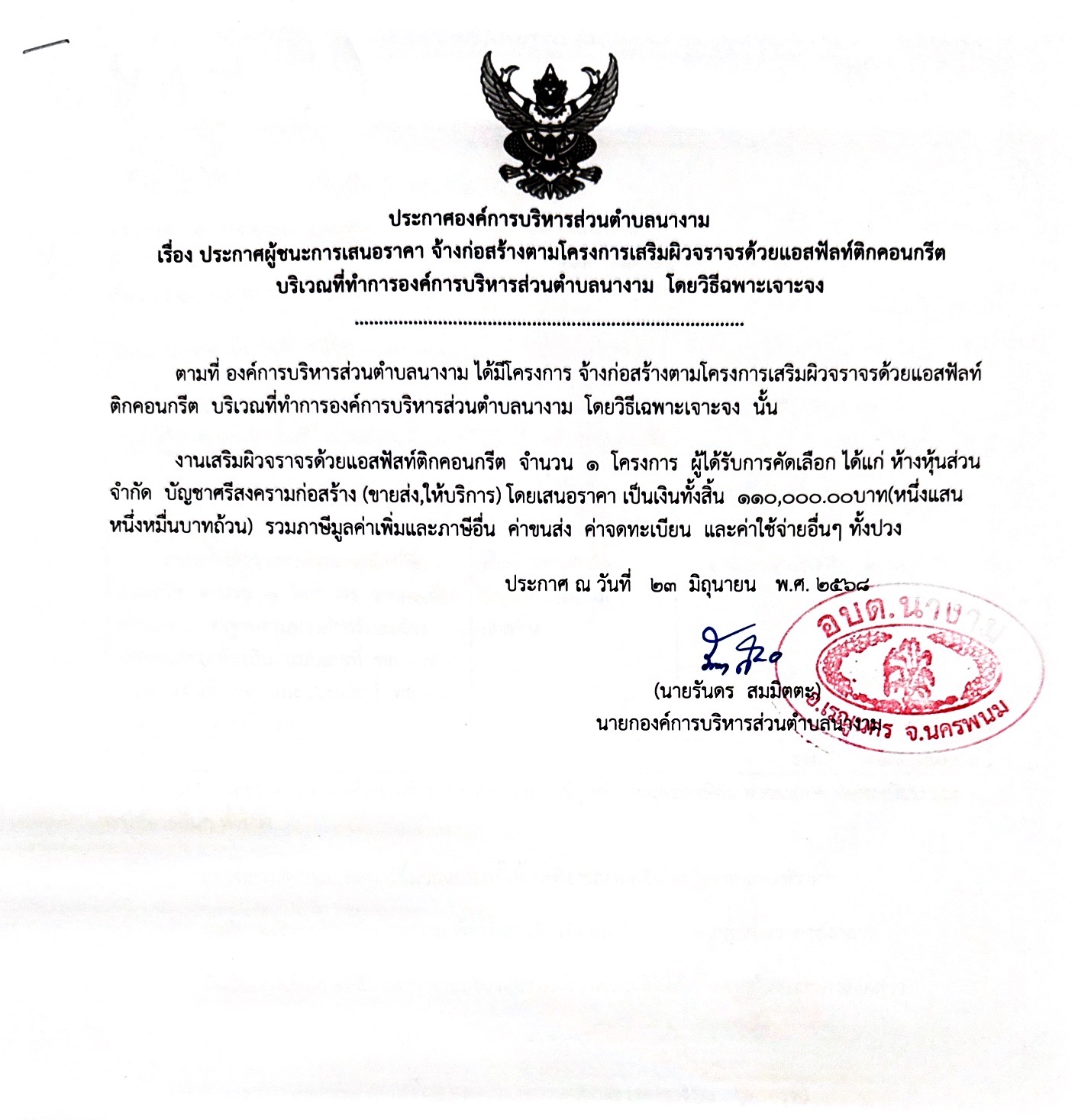 ประกาศผู้ชนะการเสนอราคา จ้างก่อสร้างตามโครงการเสริมผิวจราจรด้วยแอสฟัลท์ ติกคอนกรีต บริเวณที่ทำการองค์การบริหารส่วนตำบลนางาม โดยวิธีเฉพาะเจาะจง