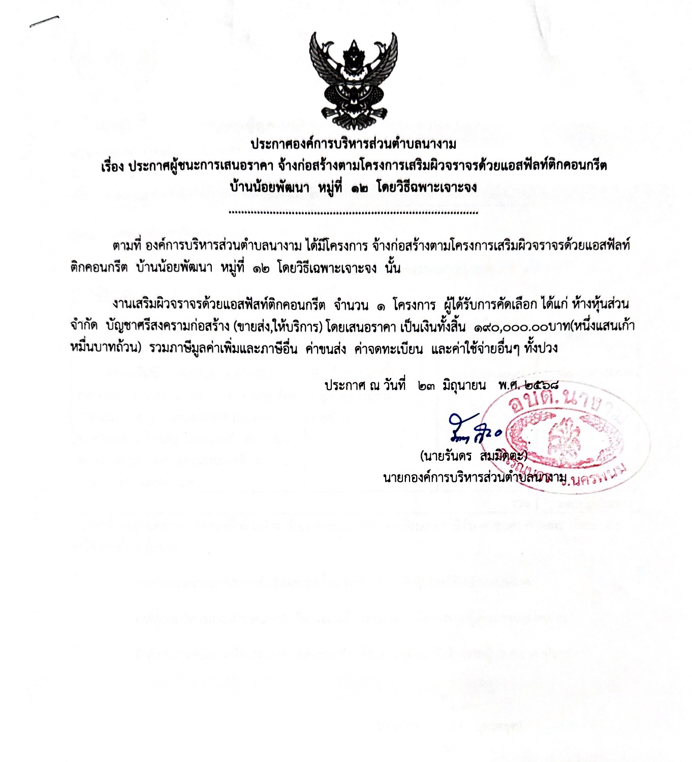 ประกาศผู้ชนะการเสนอราคา จ้างก่อสร้างตามโครงการเสริมผิวจราจรด้วยแอสฟัลท์ บ้านน้อยพัฒนา หมู่ที่ 12 โดยวิธีเฉพาะเจาะจง
