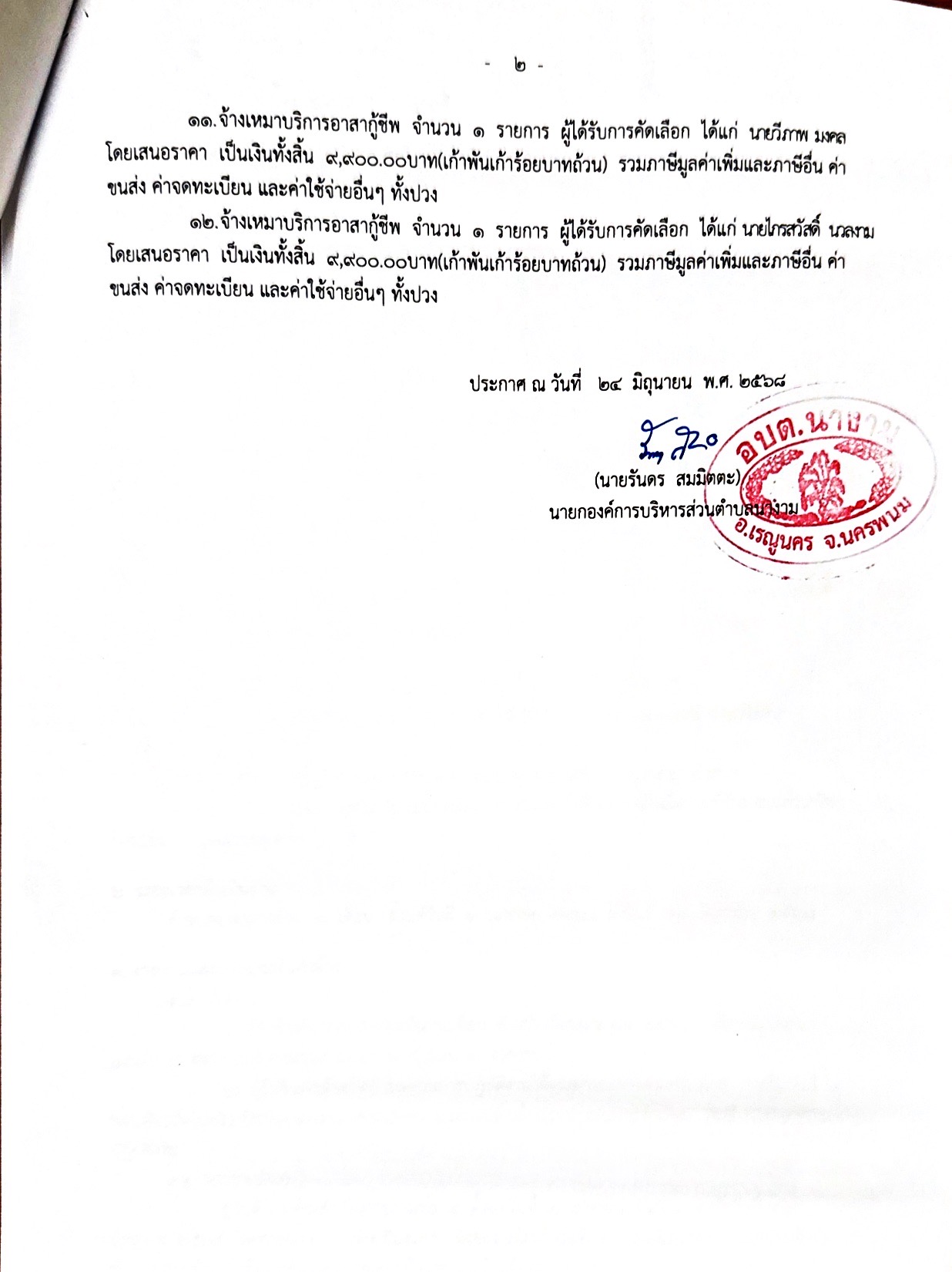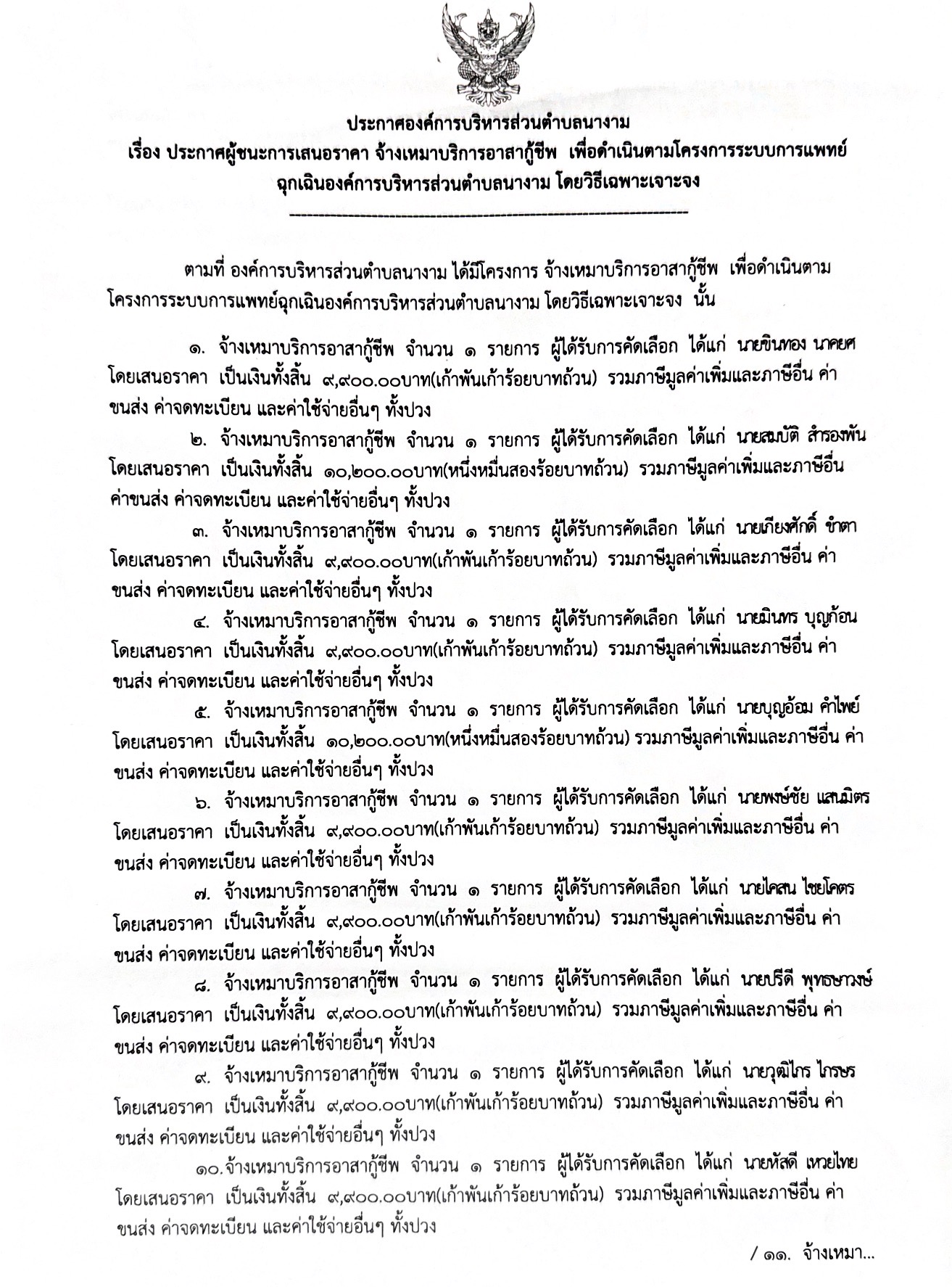 ประกาศผู้ชนะการเสนอราคา จ้างเหมาบริการอาสากู้ชีพ เพื่อดำเนินตามโครงการระบบการเเพทย์ฉุกเฉินองค์การบริหารส่วนตำบลนางาม โดยวิธีเฉพาะเจาะจง