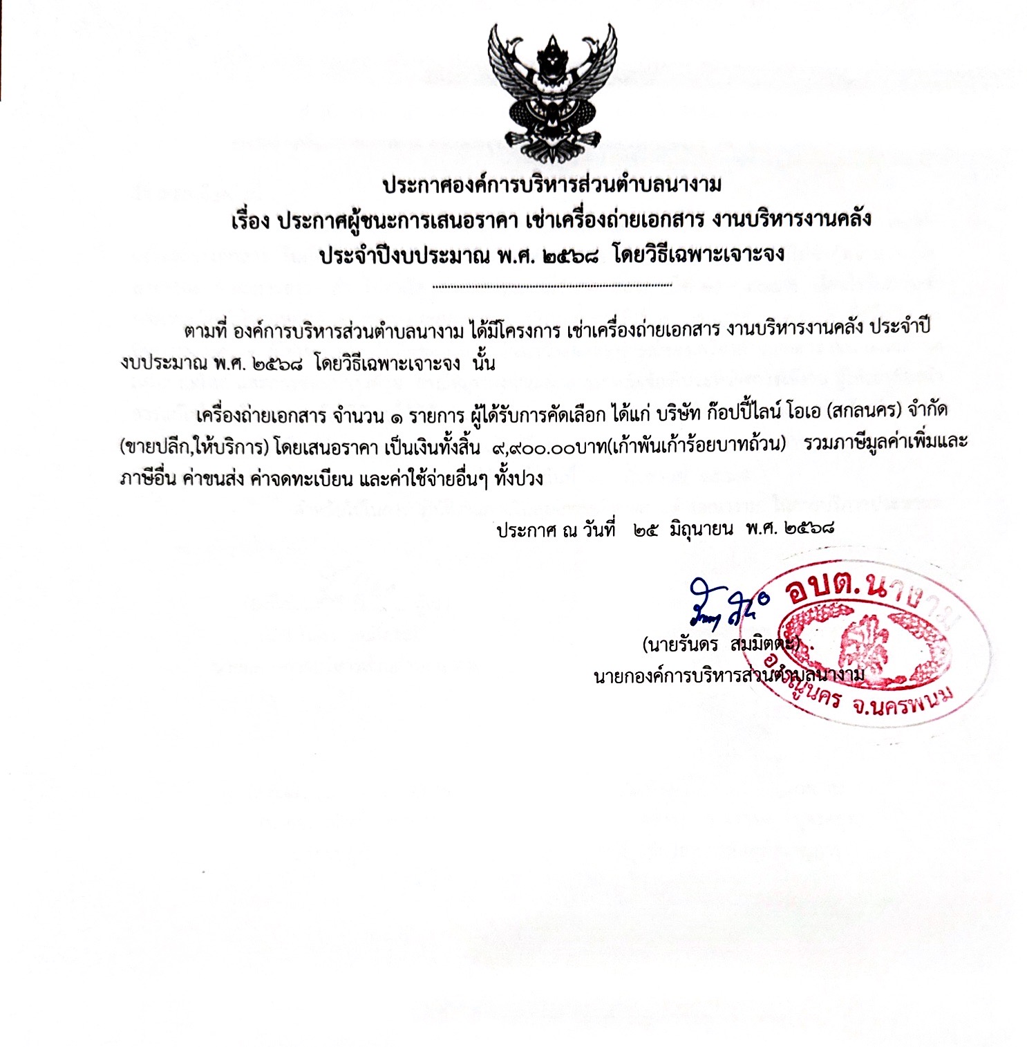 ประกาศผู้ชนะการเสนอราคา เช่าเครื่องถ่ายเอกสาร งานบริหารงานคลัง ประจำปีงบประมาณ พ.ศ. ๒๕๖๘ โดยวิธีเฉพาะเจาะจง