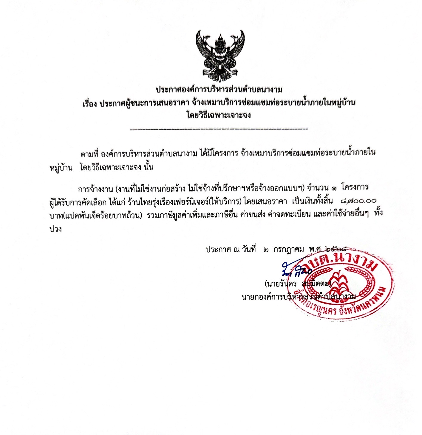 ประกาศผู้ชนะการเสนอราคา จ้างเหมาบริการซ่อมแซมท่อระบายน้ำภายในหมู่บ้าน โดยวิธีเฉพาะเจาะจง