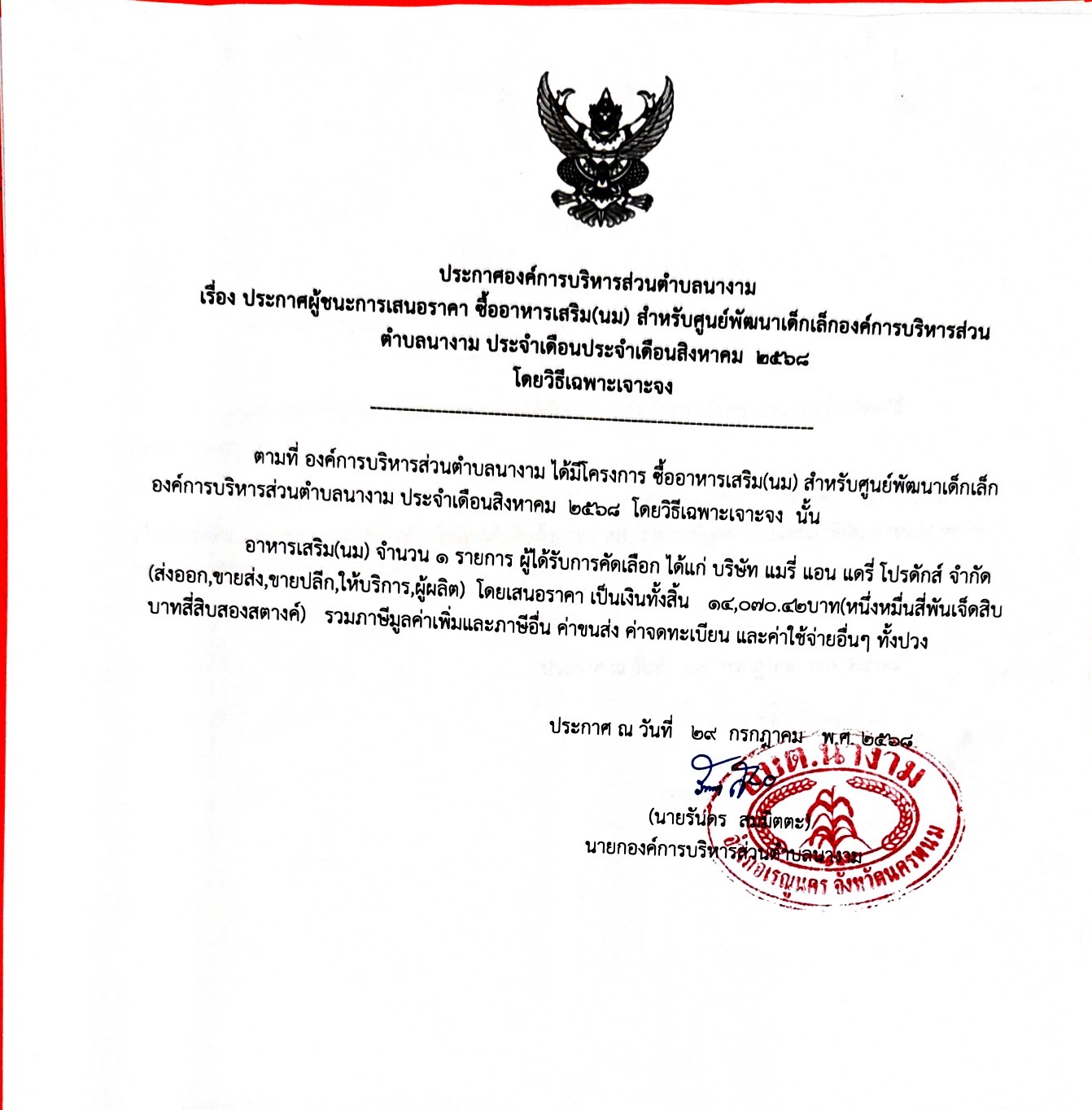 ประกาศผู้ชนะการเสนอราคา ซื้ออาหารเสริม(นม) สำหรับศูนย์พัฒนาเด็กเล็กองค์การบริหารส่วนตำบลนางาม ประจำเดือนสิงหาคม ๒๕๖๘ โดยวิธีเฉพาะเจาะจง