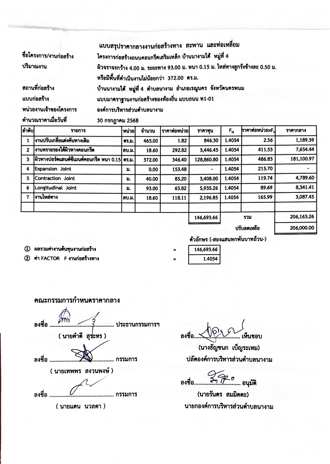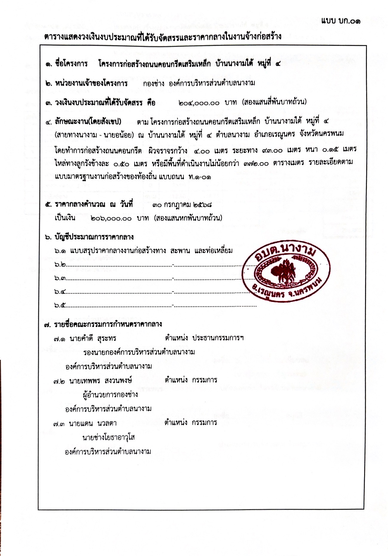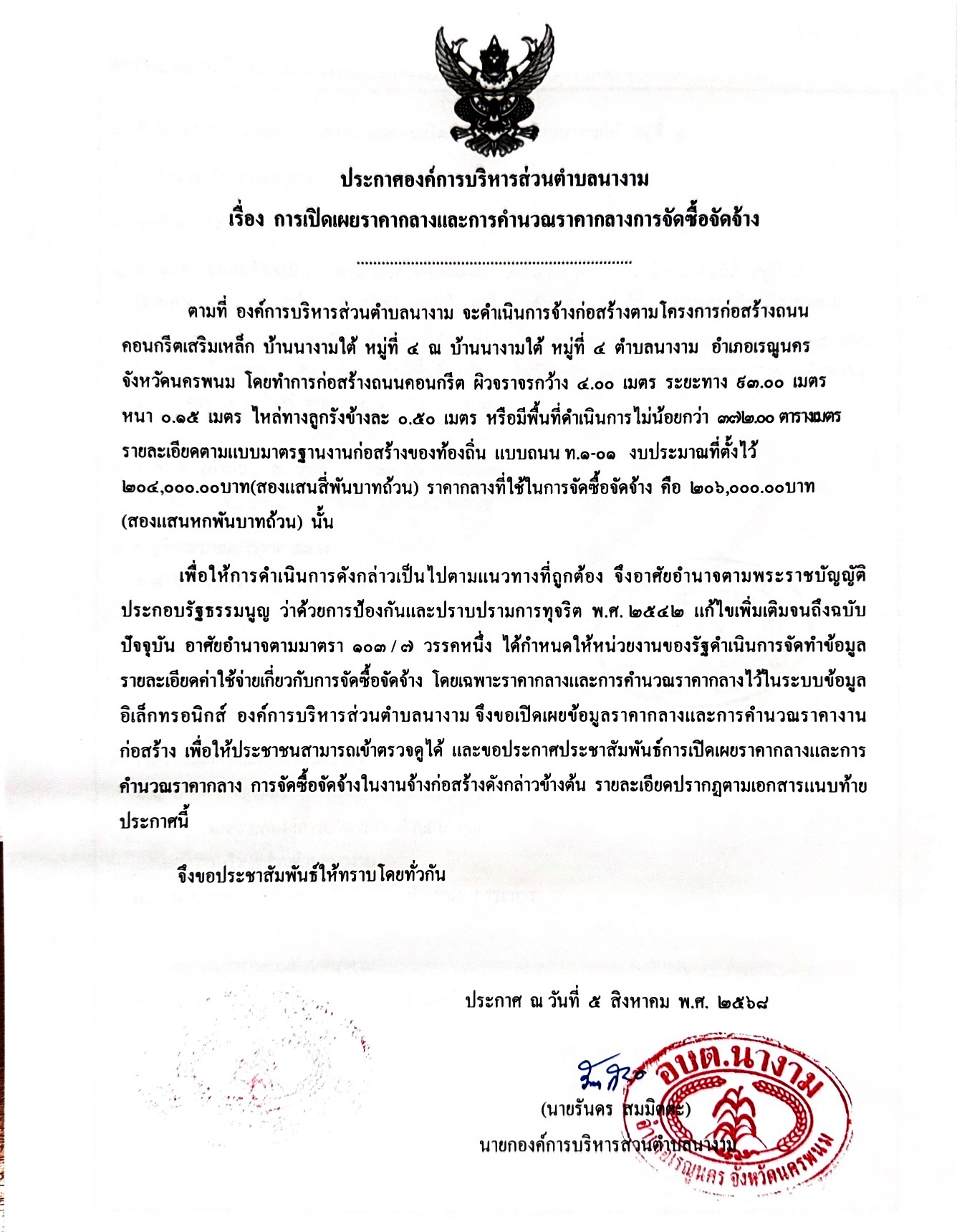 ประชาสัมพันธ์การเปิดเผยราคากลาง จ้างตามโครงการก่อสร้างถนนคอนกรีตเสริมเหล็ก บ้านนางามใต้ หมู่ที่ 4 โดยวิธีเฉพาะเจาะจง