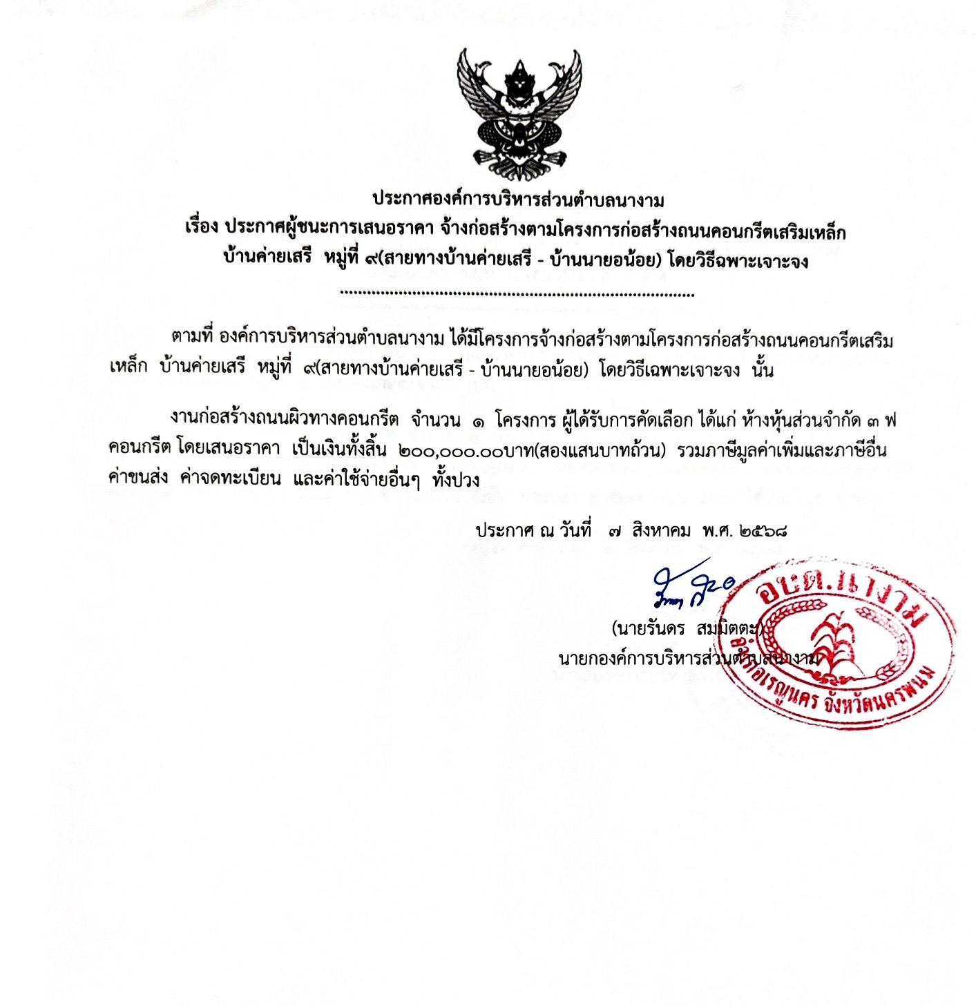 ชื่อเรื่อง : ประกาศผู้ชนะการเสนอราคา จ้างตามโครงการก่อสร้างถนนคอนกรีตเสริมเหล็ก บ้านค่ายเสรี หมู่ที่ 9(สายทางบ้านค่ายเสรี - บ้านนายอน้อย) โดยวิธีเฉพาะเจาะจง