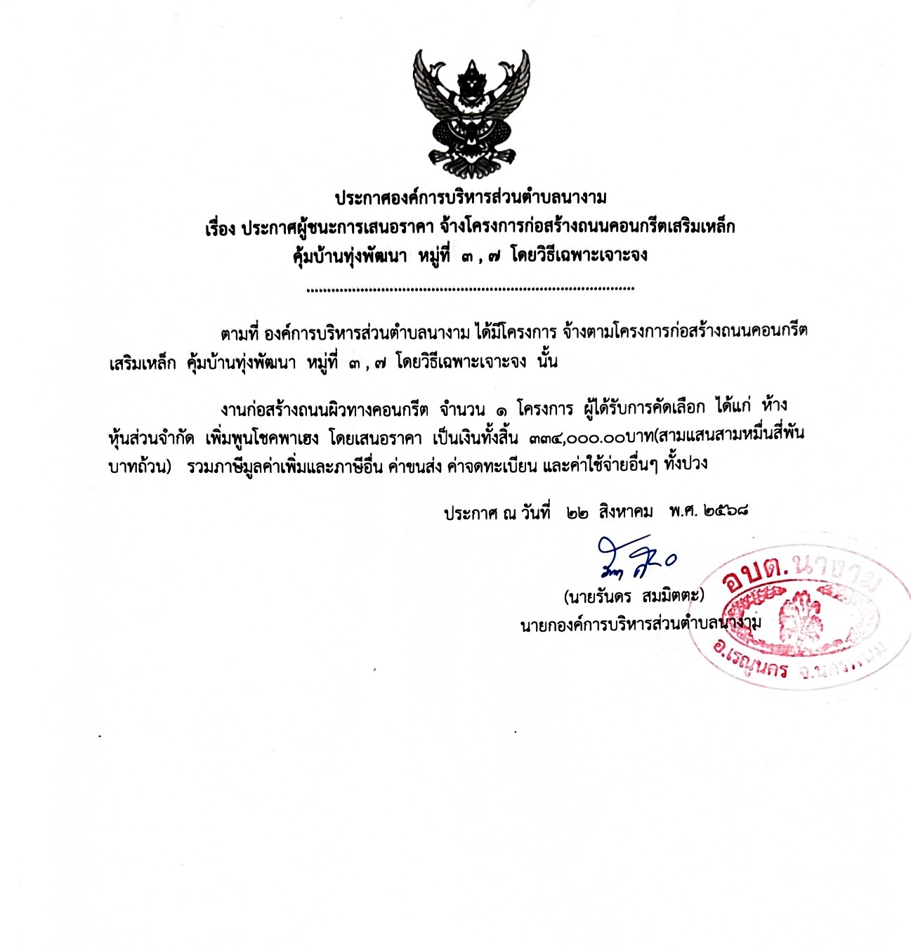 ประกาศผู้ชนะการเสนอราคา จ้างตามโครงการก่อสร้างถนนคอนกรีตเสริมเหล็ก คุ้มบ้านทุ่งพัฒนา หมู่ที่ 3 , 7 โดยวิธีเฉพาะเจาะจง