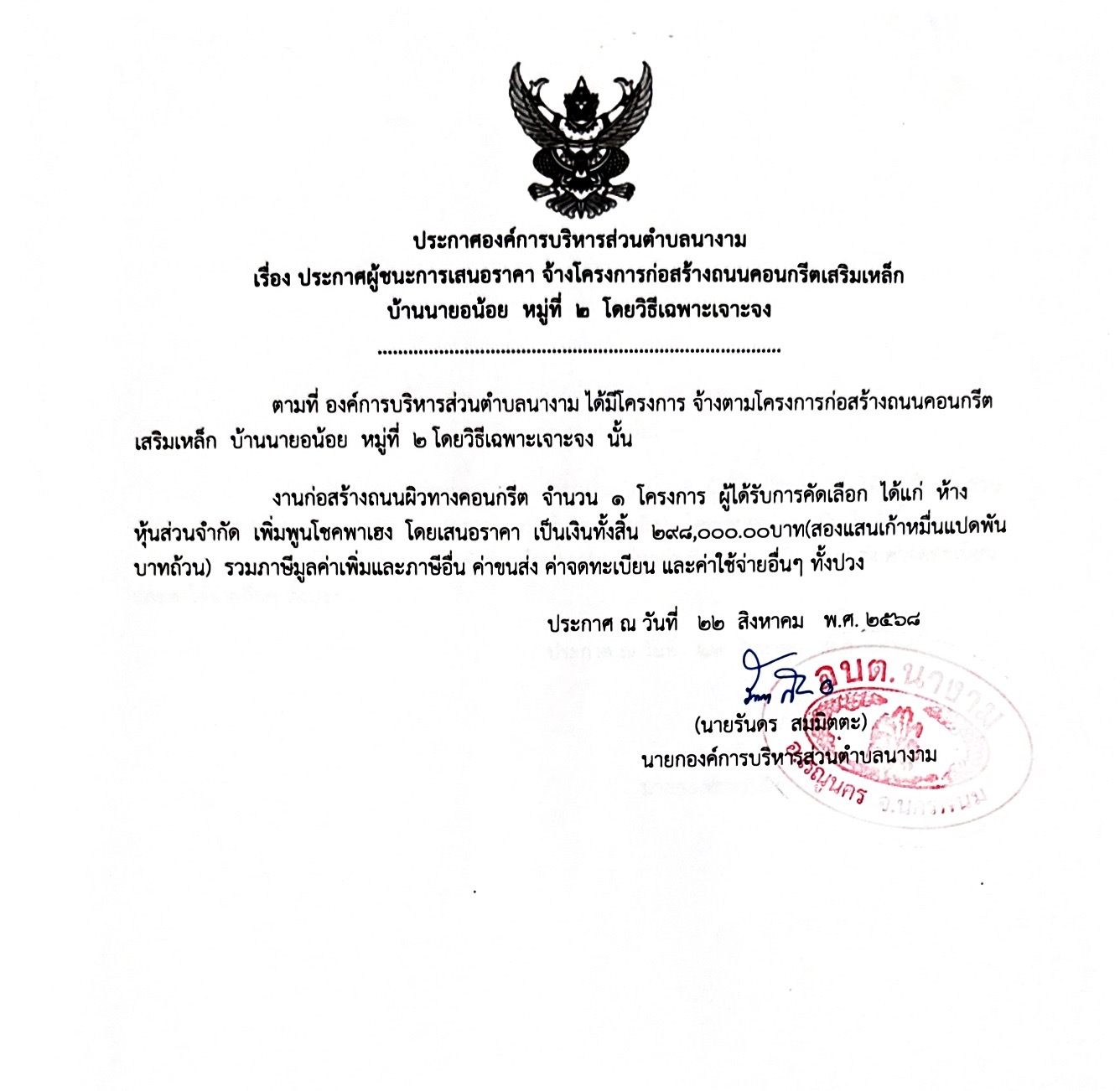 ประกาศผู้ชนะการเสนอราคา จ้างตามโครงการก่อสร้างถนนคอนกรีตเสริมเหล็ก บ้านนายอน้อย หมู่ที่ 2 โดยวิธีเฉพาะเจาะจง