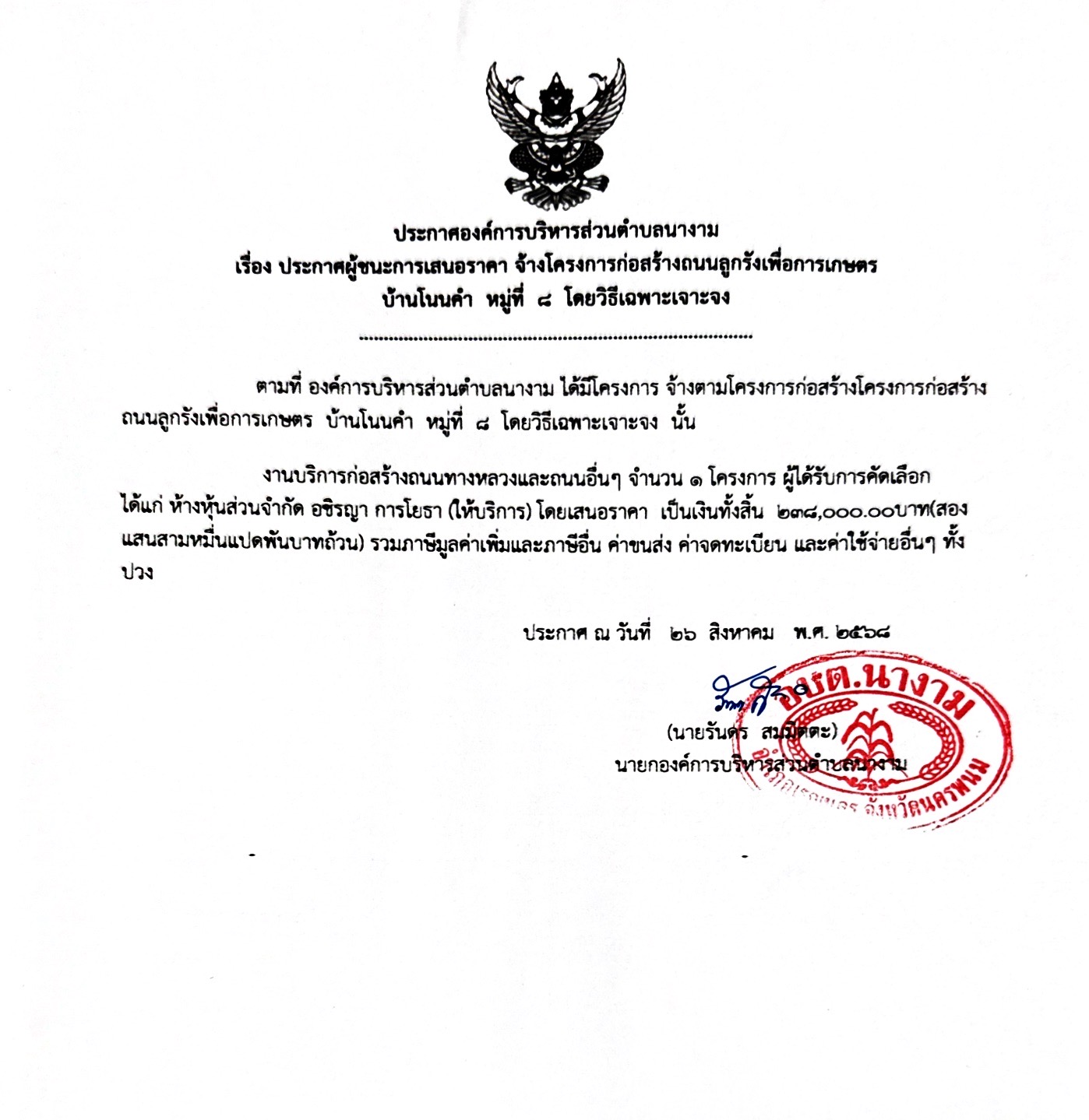 ประกาศผู้ชนะการเสนอราคา จ้างตามโครงการก่อสร้างถนนลูกรังเพื่อการเกษตร บ้านโนนคำ หมู่ที่ 8 โดยวิธีเฉพาะเจาะจง