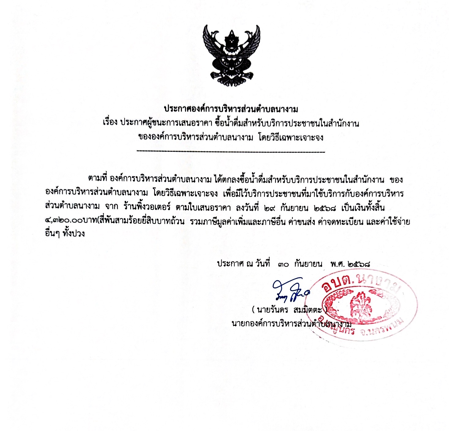ประกาศผู้ชนะการเสนอราคา ซื้อน้ำดื่มสำหรับบริการประชาชนในสำนักงานขอองค์การบริหารส่วนตำบลนางาม โดยวิธีเฉพาะเจาะจง