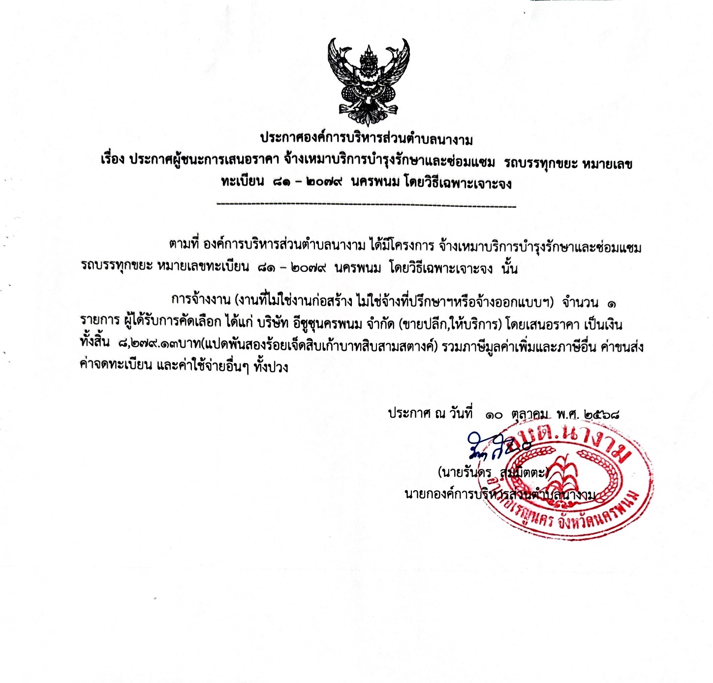 ชื่อเรื่อง : ประกาศผู้ชนะการเสนอราคา จ้างเหมาบริการบำรุงรักษาและซ่อมแซม รถบรรทุกขยะ หมายเลขทะเบียน ๘๑ - ๒๐๗๙ นครพนม โดยวิธีเฉพาะเจาะจง