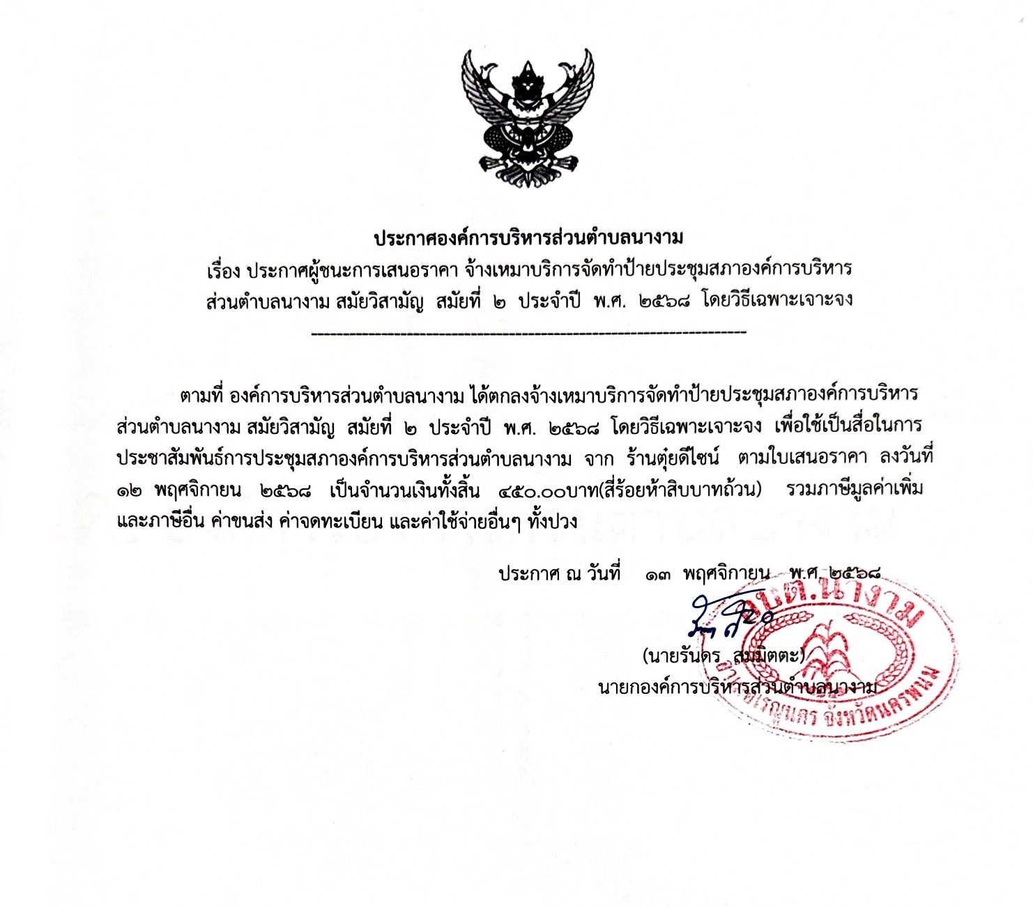 ชื่อเรื่อง : ประกาศผู้ชนะการเสนอราคา จ้างเหมาบริการจัดทำป้ายประชุมสภาองค์การบริหารส่วนตำบลนางาม สมัยวิสามัญ สมัยที่ 2 ประจำปี พ.ศ. 2568 โดยวิธีเฉพราะเจาะจง